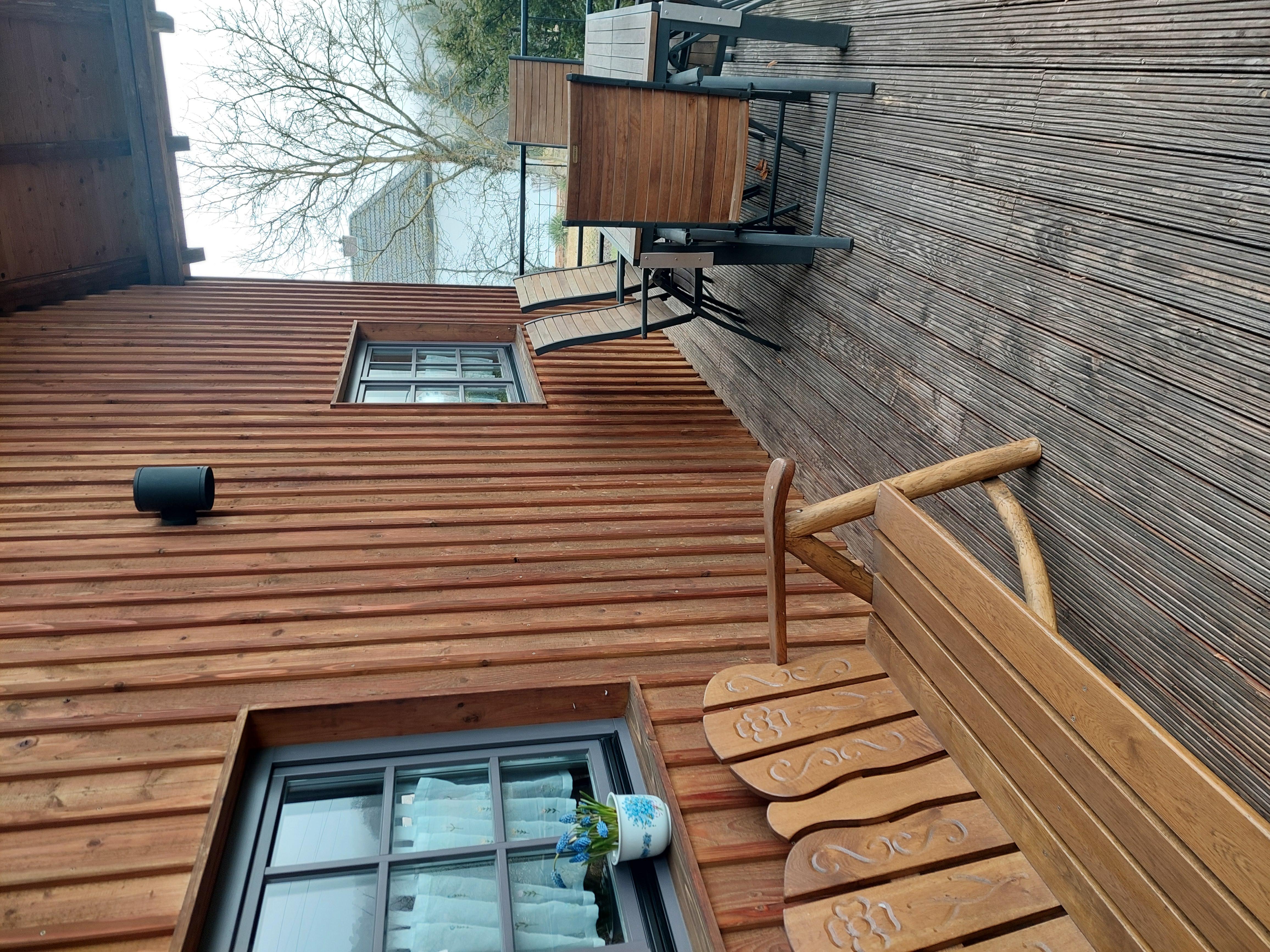 Diese ist mit Gartenmöbeln aus Holz ausgestattet.