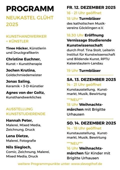 Veranstaltung Neukastel glüht 2025 Veranstaltungsort Slevogthof Leinsweiler Veranstaltungs-Adresse Slevogthof 76829 Leinsweiler Karte ausblendenKarte einblenden post@spokk.cloud Termine Fr., 12.12.2025 - 16:00 Uhr Sa., 13.12.2025 - 14:00 Uhr So., 14.12.2025 - 14:00 Uhr Locate 49.186863934525, 8.0179171614075
