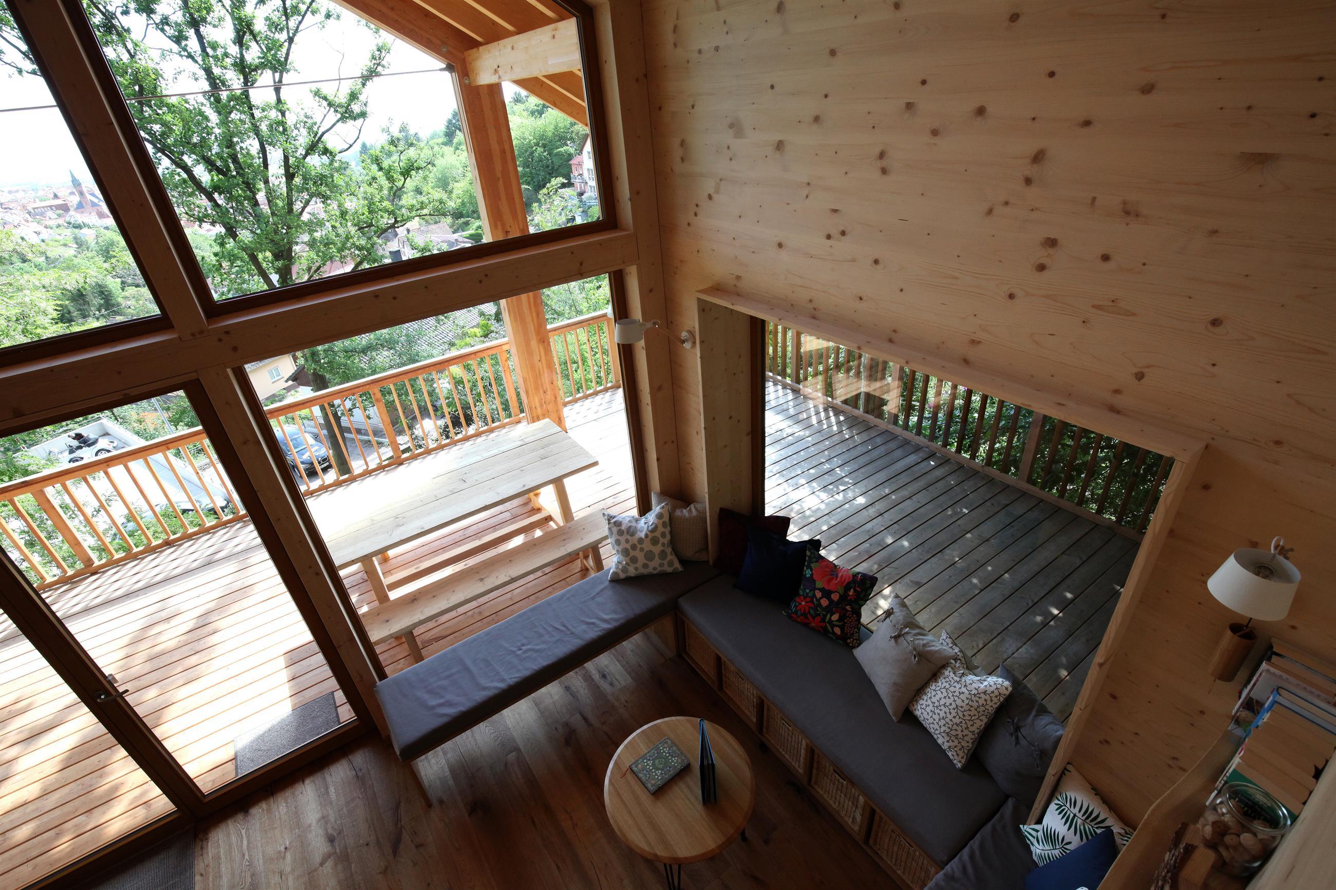 Es ist naturnah eingerichtet und wird so zu einem behaglichen und modernen Refugium für bis zu sechs Personen. Ganz bewusst gibt es hier kein Internet und kein Fernsehgerät, um eine erholsame Reduktion auf das Wesentliche und viel Ruhe zu erzeugen. Das Bett im Schlafzimmer lässt sich auf den umlaufenden Balkon schieben, so dass man die Nacht unter den Bäumen verbringen kann!