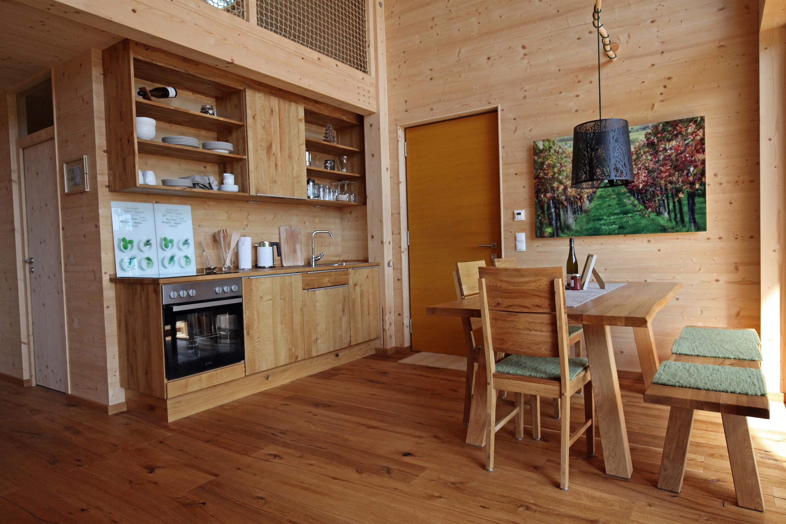 Hier genießt man die Natur - auf dem großen umlaufenden Balkon mit Holzdielen oder beim Wandern und Radeln in der Umgebung. Das neu erbaute Holzhaus auf Stelzen mit Panoramablick in die Rheinebene hat eine voll ausgestattete Küche, Dusche/WC, sep. Schlafzimmer und offene Galerie mit weiteren Schlafmöglichkeiten.