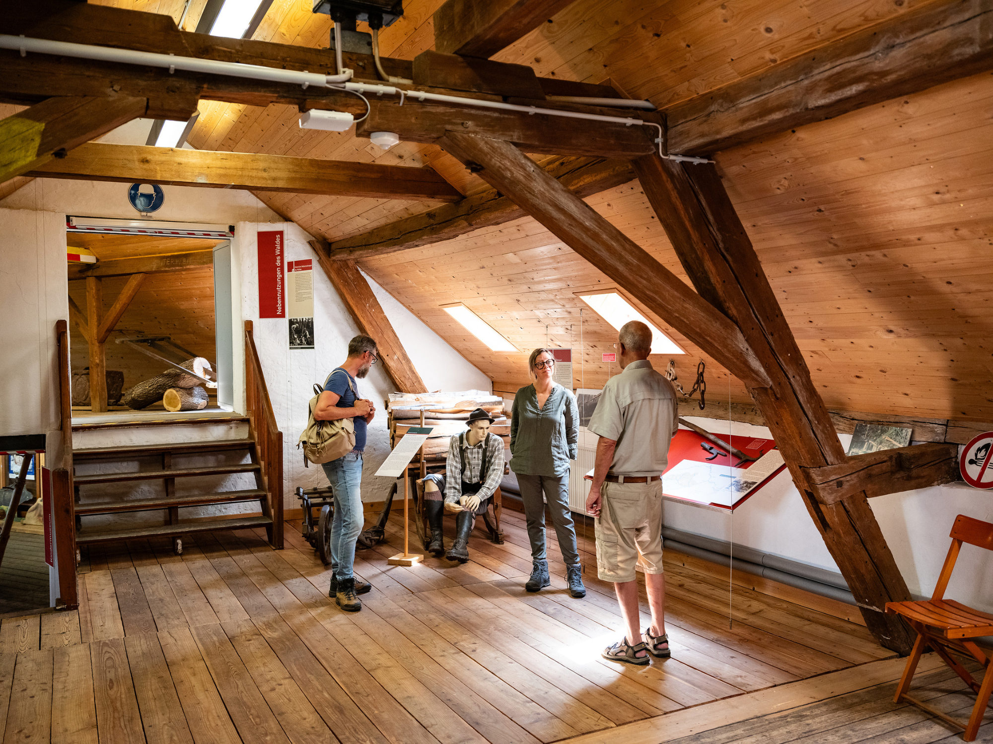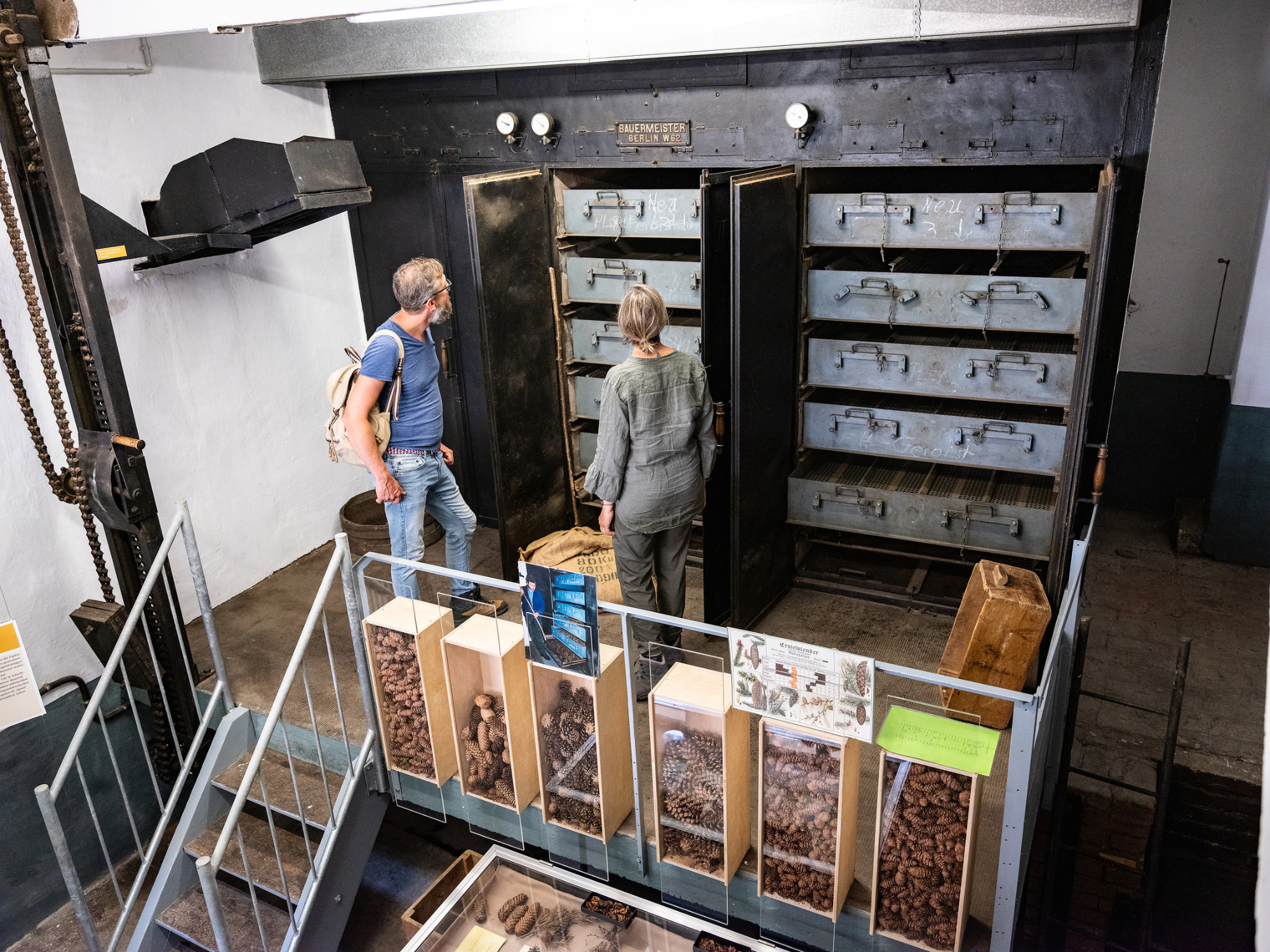 In Elmstein bereiteten die Waldarbeiter seinerzeit überwiegend Samen von Nadelbäumen auf. Um an sie zu gelangen, mussten sie die Stämme hochklettern und die Zapfen von Fichten, Kiefern, Douglasien oder Lärchen ernten. Die Zapfen füllte man in einen großen Darrofen, in dem sie bei maximal 60 Grad getrocknet wurden. Dann kamen die getrockneten Zapfen in eine Längstrommel, in der durch Rotation die Samen herausfielen. Diese mussten dann mit einem sogenannten Bürstenentflügler von den winzigen Flügeln geholt werden, bevor schließlich im Steigsichter brauchbare Vollkörner von Hohlkörnern getrennt werden. Luftdicht verpackt blieben die Samen kühl gelagert bis zu 30 Jahre keimfähig. Das Museum vermittelt daneben, wie sich Waldarbeit seit dem 19. Jahrhundert gewandelt hat. Auch der Holztransport ist Thema, womit direkt an den Trifterlebnispfad angeknüpft wird.