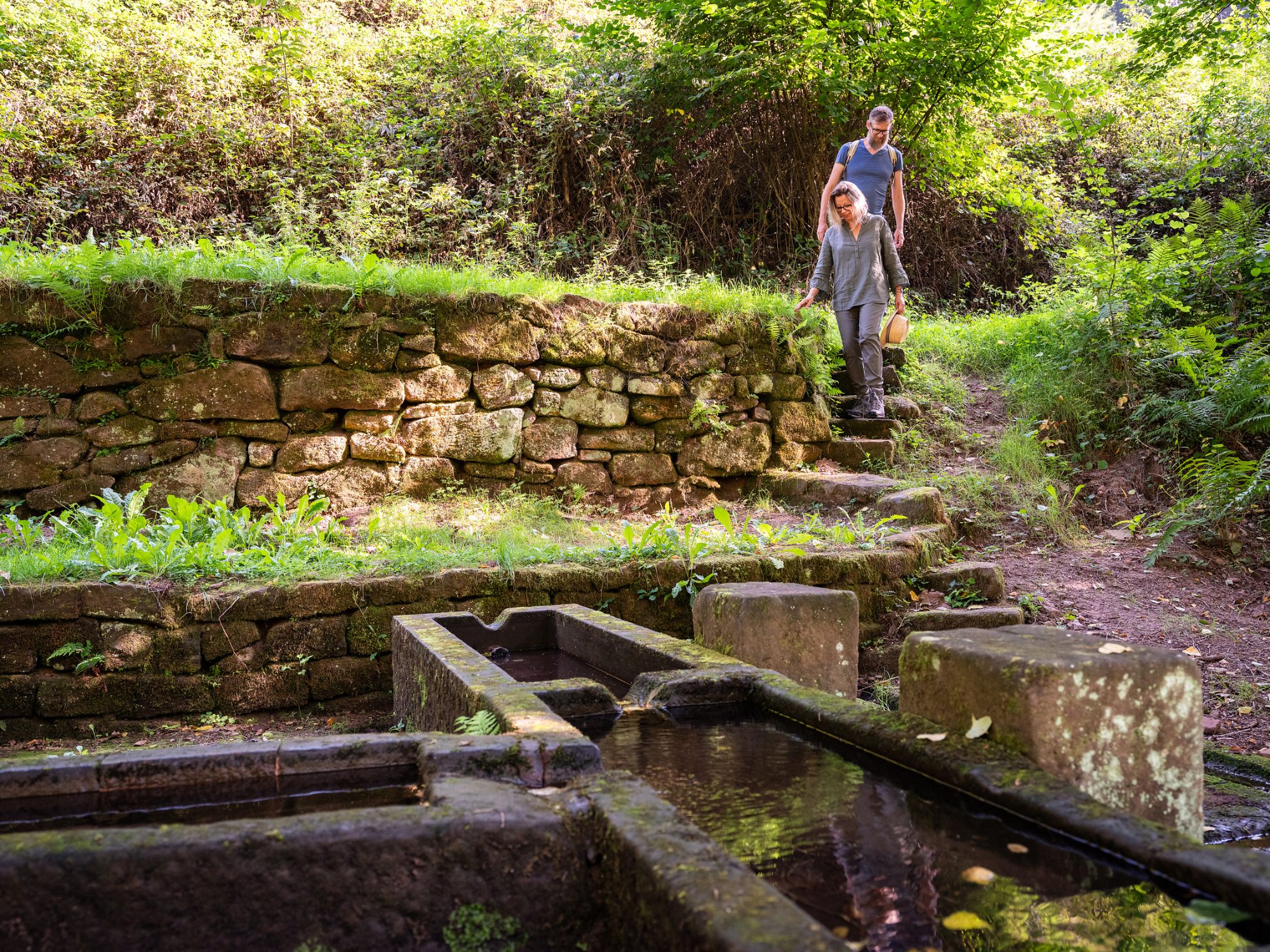 Der Prädikatswanderweg – insgesamt 15 Kilometer lang, die in zwei Abschnitte geteilt werden können – führt vorbei an Brunnen, die früher als Viehtränken und Waschbrunnen dienten. Der etwa 250 Jahre alte Straufelsbrunnen, heute ein Platz für Pause und Picknick, wurde zudem zur Bewässerung der Felder und Wiesen im Straufelstal genutzt. Beim Wandern stößt man mitten im Wald immer wieder auf Brunnen, an denen man seinen Durst mit reinem Quellwasser stillen kann. In der Waldgemeinde Esthal gab es bis Ende des 19. Jahrhunderts vier Tiefbrunnen, danach begann die Wasserverteilung über Leitungen. Die Versorgung von Mensch und Tier war zuvor ausgesprochen mühsam. Schließlich musste das Wasser aus den in den Tälern gelegenen Brunnen mit Kübeln und Eimern zu den Haushalten transportiert werden.