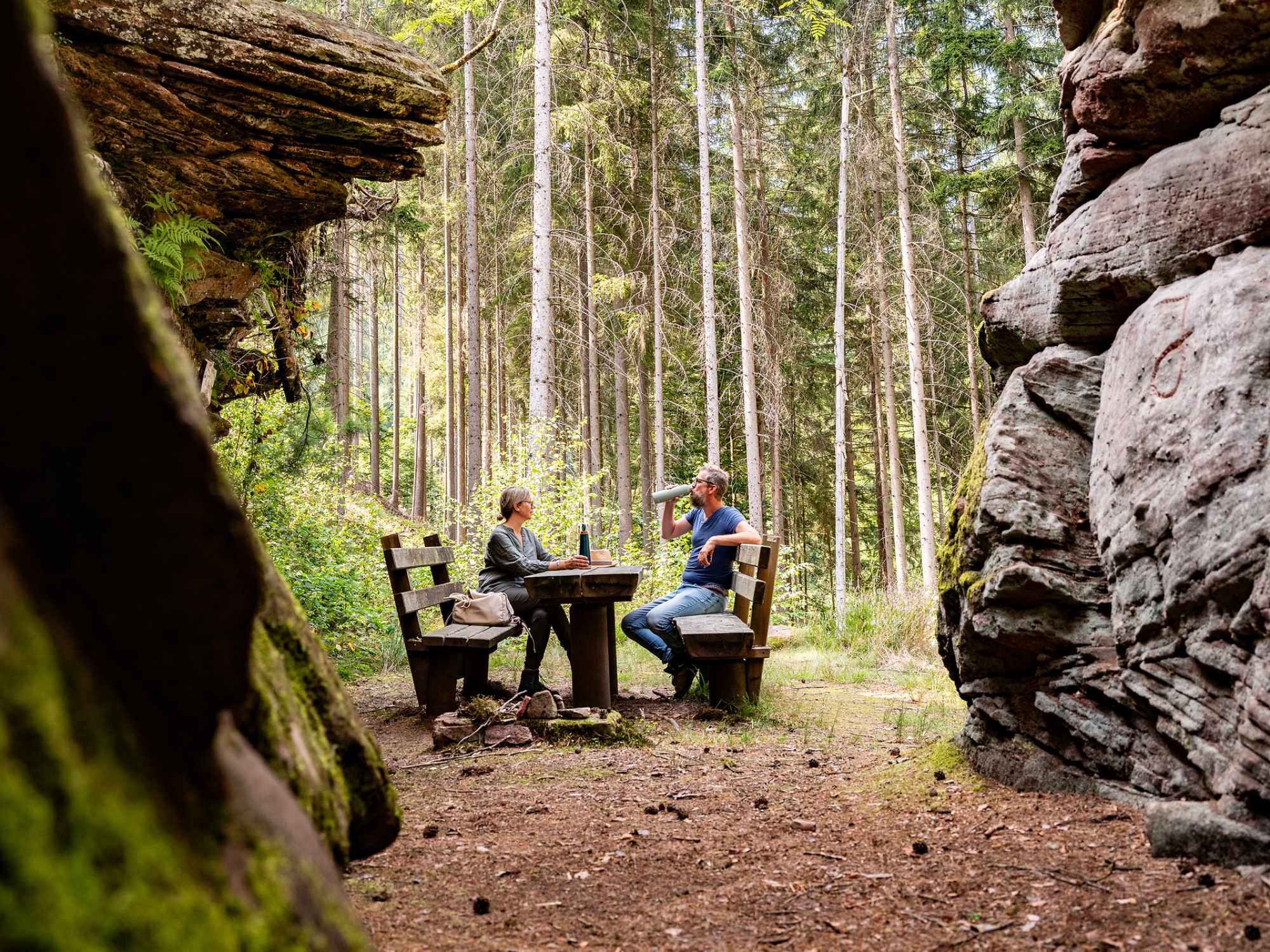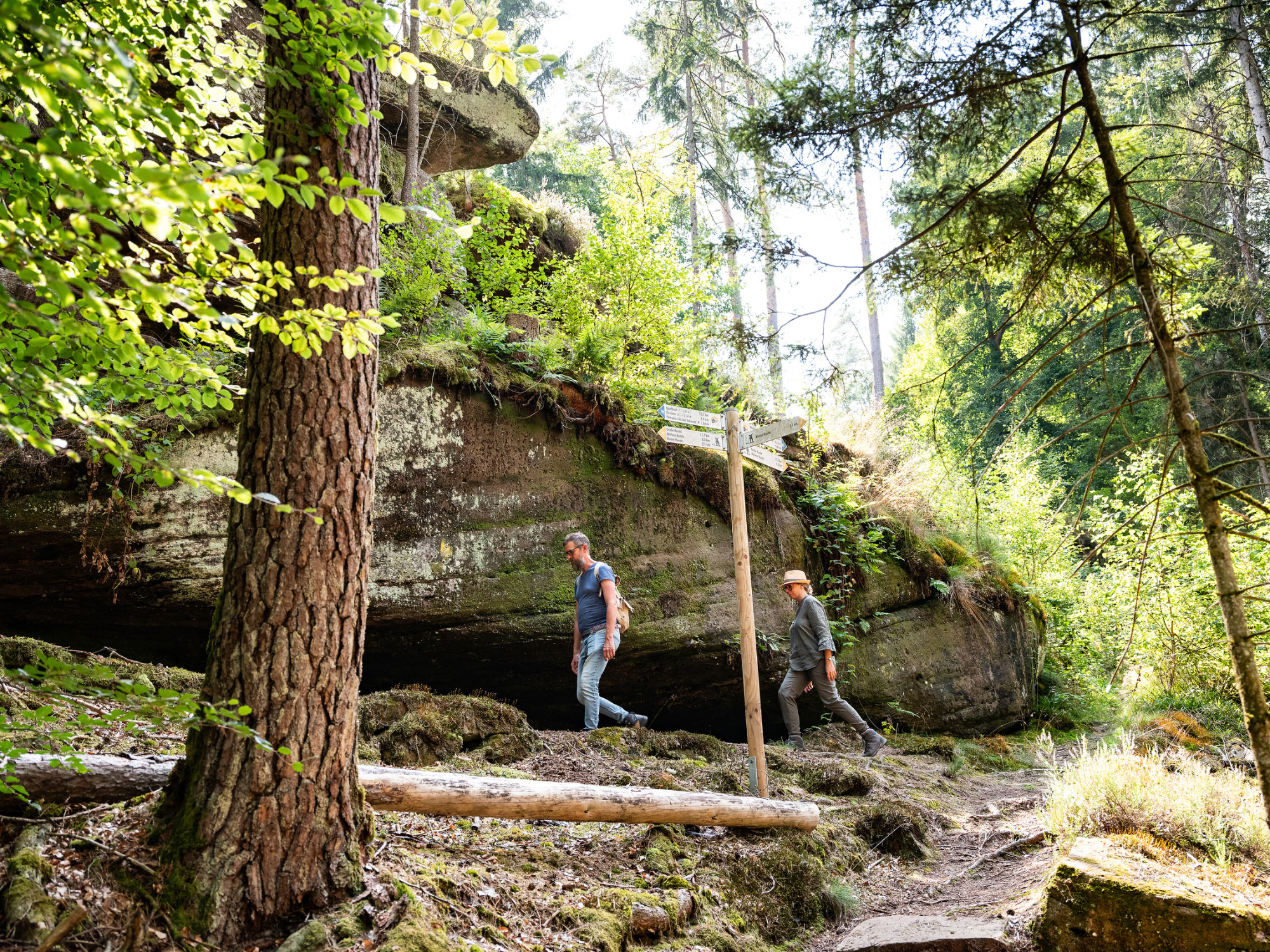 Auch das Wasser selbst diente als Transportweg. Denn das Holz, das inmitten des Pfälzerwaldes rund um Elmstein geschlagen wurde, galt es in die Rheinebene zu bringen. Funktioniert hat dies über das ausgeklügelte System der Holztrift. Was schon im Mittelalter begann, wurde in der bayerischen Zeit überplant. Etwa ab 1820 sind Triftanlagen sogar in Sandstein errichtet worden. Hier staut man Wasser in Woogen an, um es bei Bedarf gezielt für den Transport der Baumstämme in den Bach einzuleiten. Am Legelbach im Elmsteiner Tal, der in den Speyerbach mündet, findet sich eines der wichtigsten und am besten erhaltenen Beispiele eines solchen Triftbachs. Am Trifterlebnispfad Legelbachtal vermitteln Infotafeln und Audiodateien viel Wissenswertes. Der Weg führt jedoch nicht nur vorbei an bis zu 200 Jahre alten Bauwerken, sondern immer auch durch das satte Grün der Natur und – zum Beispiel – dem Nibelungenfels. Das in mehreren Terrassen aufgetürmte Felsmassiv oberhalb des Legelbachtals hat seinen Namen von einem Relief mit überlebensgroß wiedergegebenen Gestalten aus der Nibelungensage.