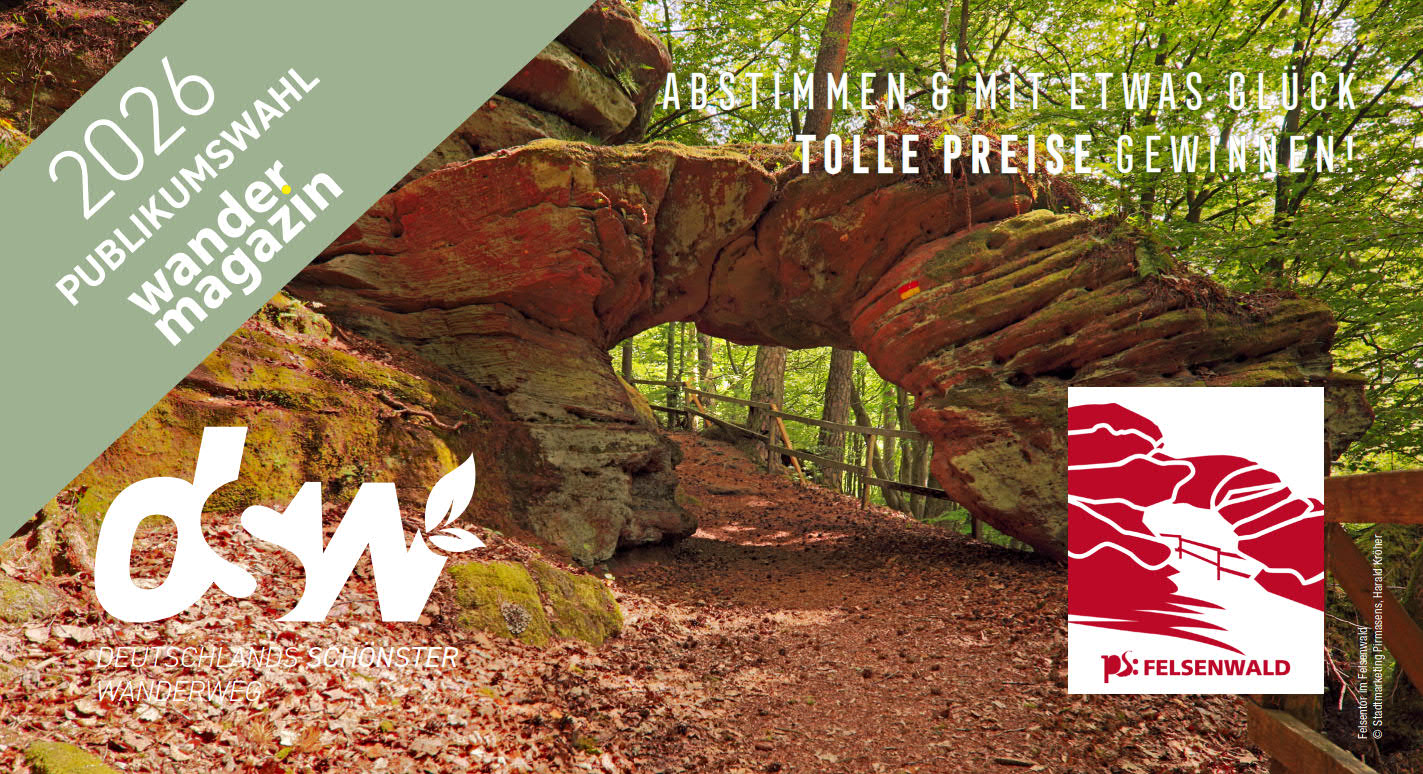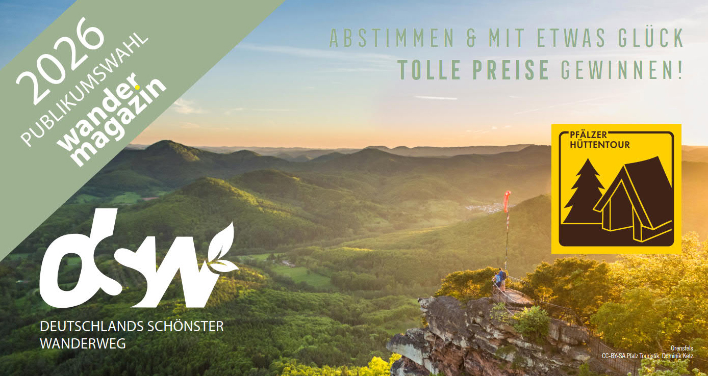 Mit dabei sind der Pfälzer Höhenweg in der Kategorie Mehrtagestouren und die Pfälzer Hüttentour und der Felsenwald Premiumwanderweg in der Kategorie Tagestouren. Die Auswahl zeigt die Vielfalt der Pfalz: von aussichtsreichen Höhenwegen über zahlreiche Waldhütten, in denen sich die als immaterielles UNESCO-Kulturerbe anerkannte Pfälzer Hüttenkultur erleben lässt, bis hin zu spektakulären Felsformationen. Seit dem 2. März 2026 könnt ihr online im Wahlstudio des Wandermagazins für eure Favoriten (Eine Stimme für Mehrtagestouren und eine für Tagestouren) abstimmen und habt dabei sogar die Chance auf tolle Preise*. Die Abstimmung läuft bis 30. Juni und im Juli wird dann Deutschlands Schönster Wanderweg 2026 gekürt.