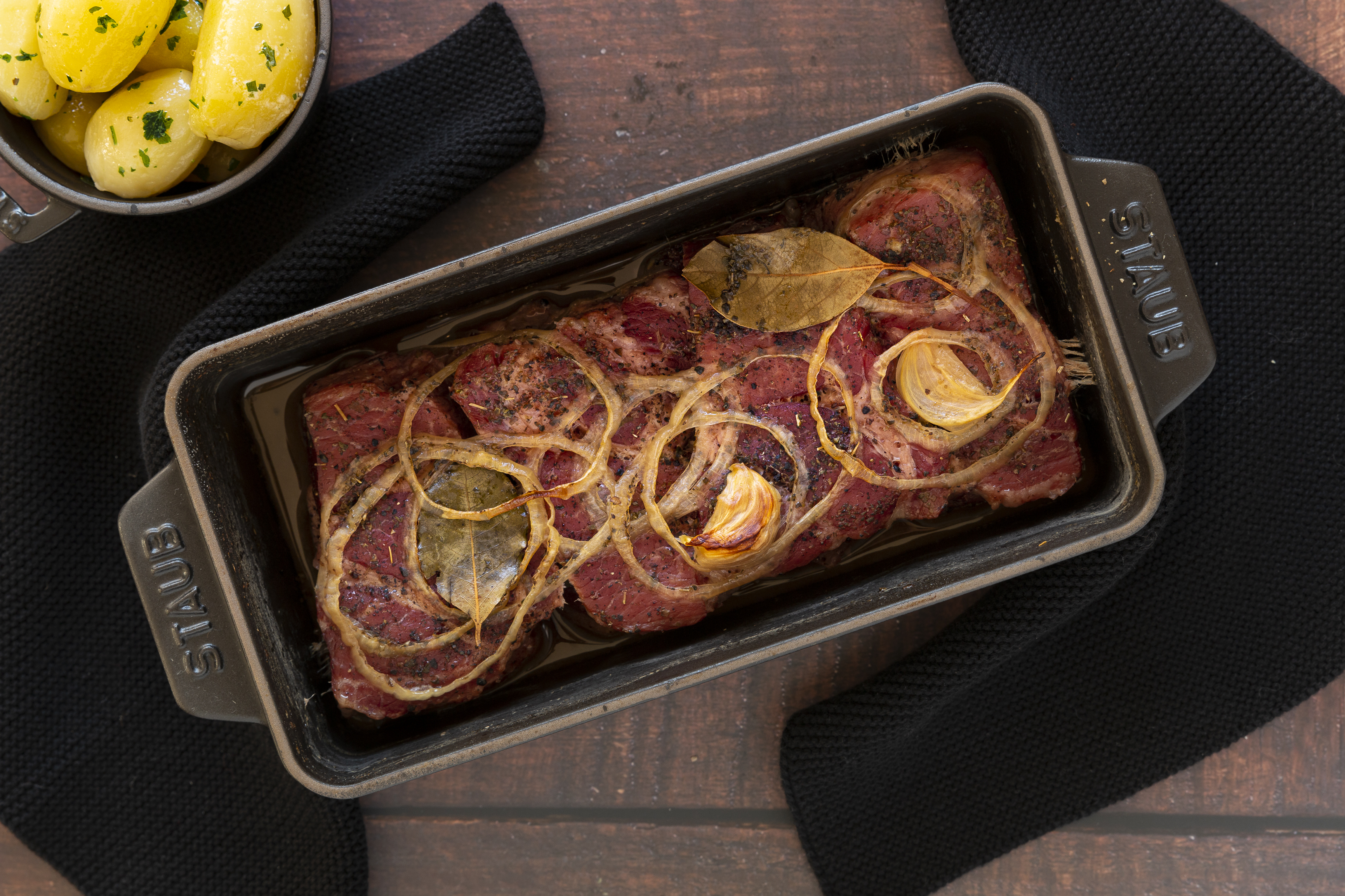 Dazu: In einer Mischung aus Wein und Wasser gegarten Quellkartoffeln und Schwarzbrot.