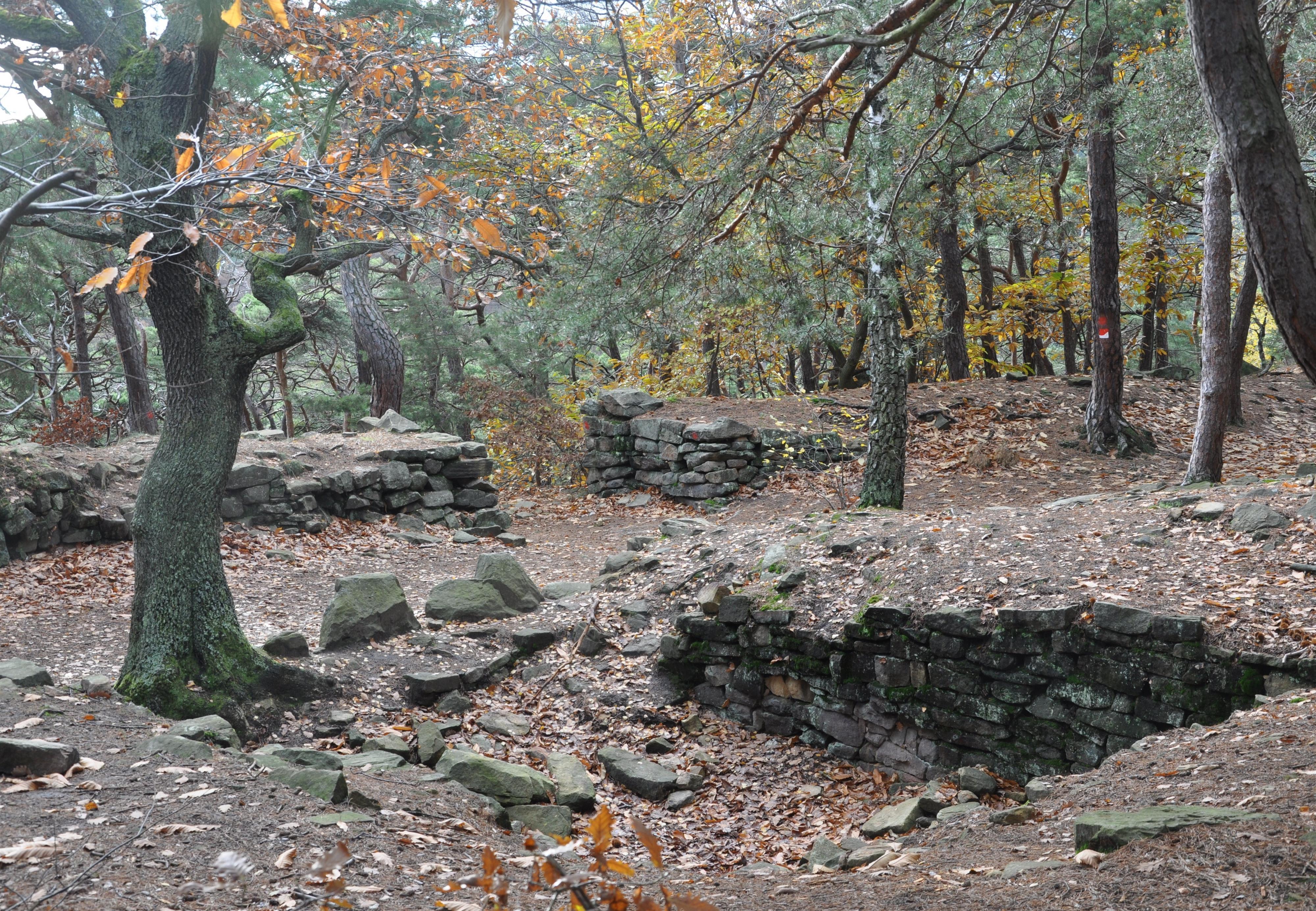 Der Berggipfel wird von einer Ringmauer umschlossen, deren größter west-östlicher Durchmesser 150 m beträgt, während der nord-südliche Durchmesser 110 m misst. Den Zugang zu der Ansiedlung ermöglichten zwei Tore, eines im Norden und das andere im Süden. Es kann davon ausgegangen werden, dass die Ringmauer aus zahlreichen Findlingen bestand, die jedoch nicht mit Mörtel verbunden wurden und ursprünglich eine Holzpalisade trug.