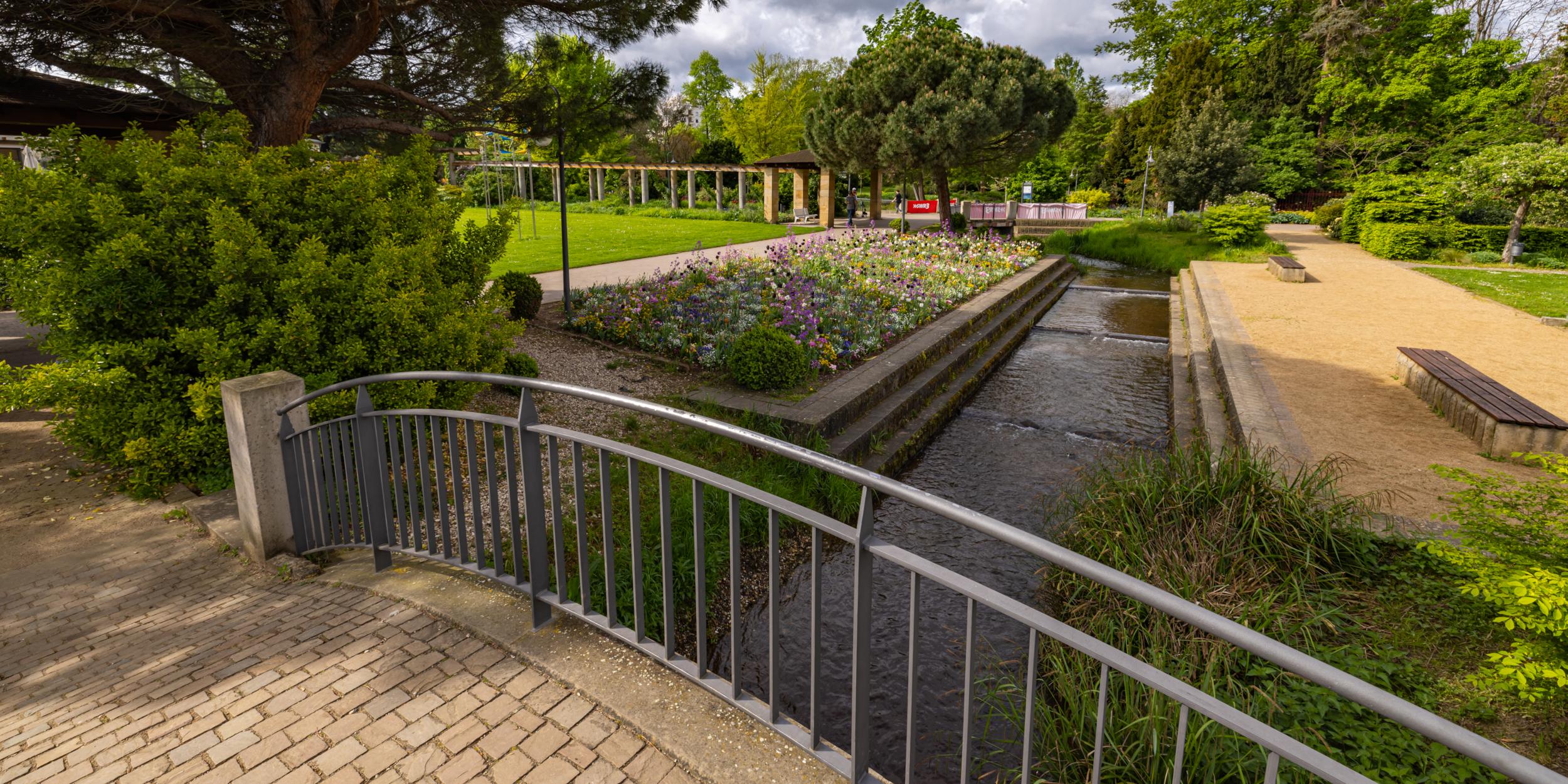 Im Herzen des früheren Ensembles aus Brunnenhalle und Traubenkur, wo die Isenach in Kaskaden dem Gradierbau entgegenfließt und das Wasser schön flach ist, bieten lange Sitzbänke aus Sandstein direkt am Wasser Gelegenheit, die Füße im kühlen Nass zu erfrischen.