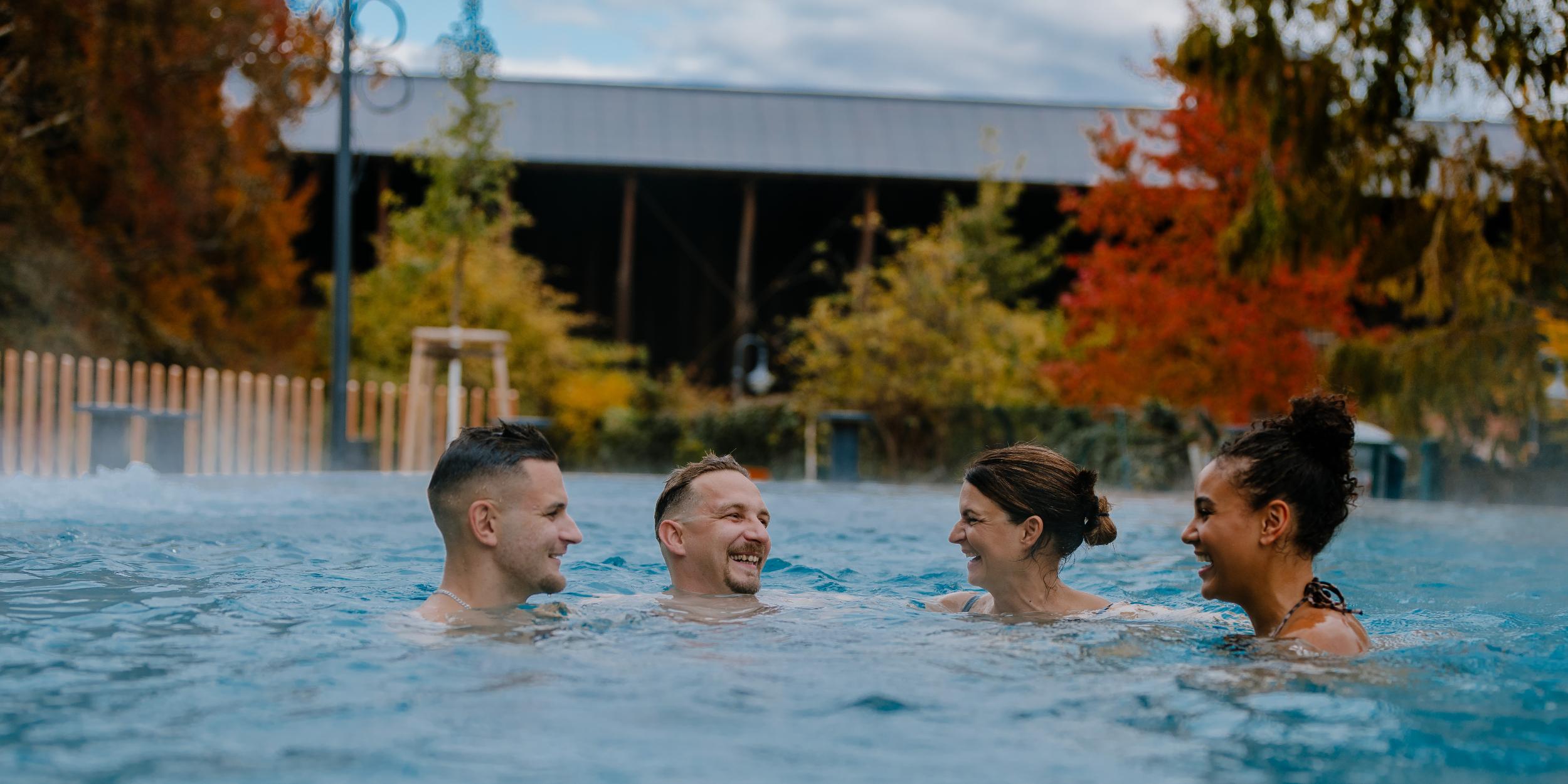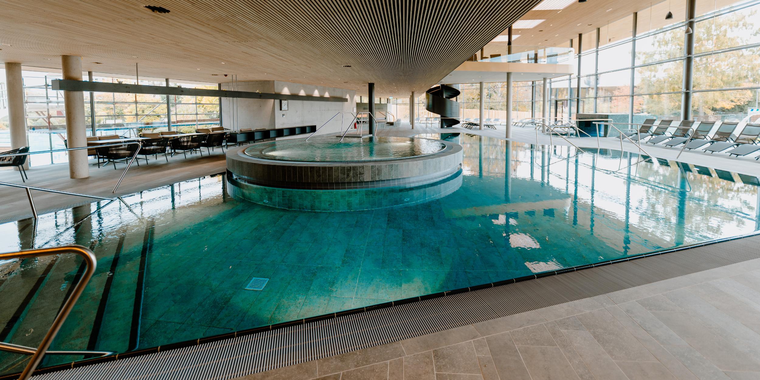 Von dort aus können Sie sich im ganzjährig geöffneten Warmaußenbecken (ab 21.11.2025) entspannen.