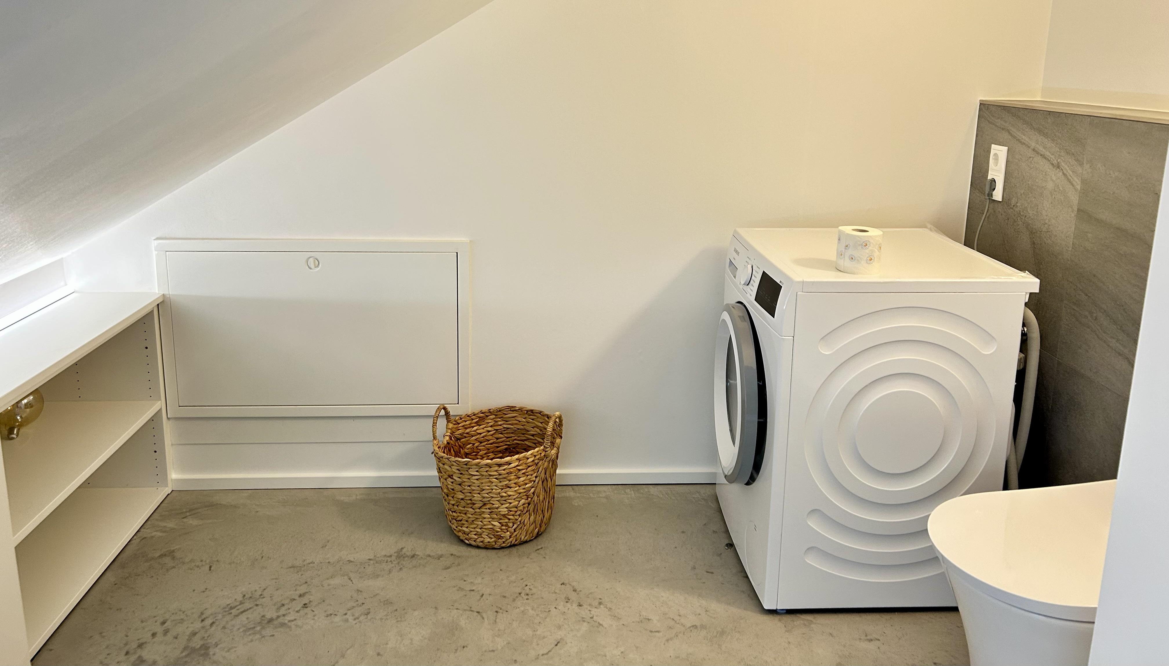 Das separate Schlafzimmer bietet ein komfortables 2 × 2 Meter großes Bett für erholsame Nächte unter dem Dachfenster sowie viel Stauraum im begehbaren Kleiderschrank. Das moderne Tageslichtbad ist mit einer großzügigen Dusche ausgestattet – perfekt zur Erholung nach Wanderungen oder Radtouren. Eine Waschmaschine steht ebenfalls zur Verfügung.