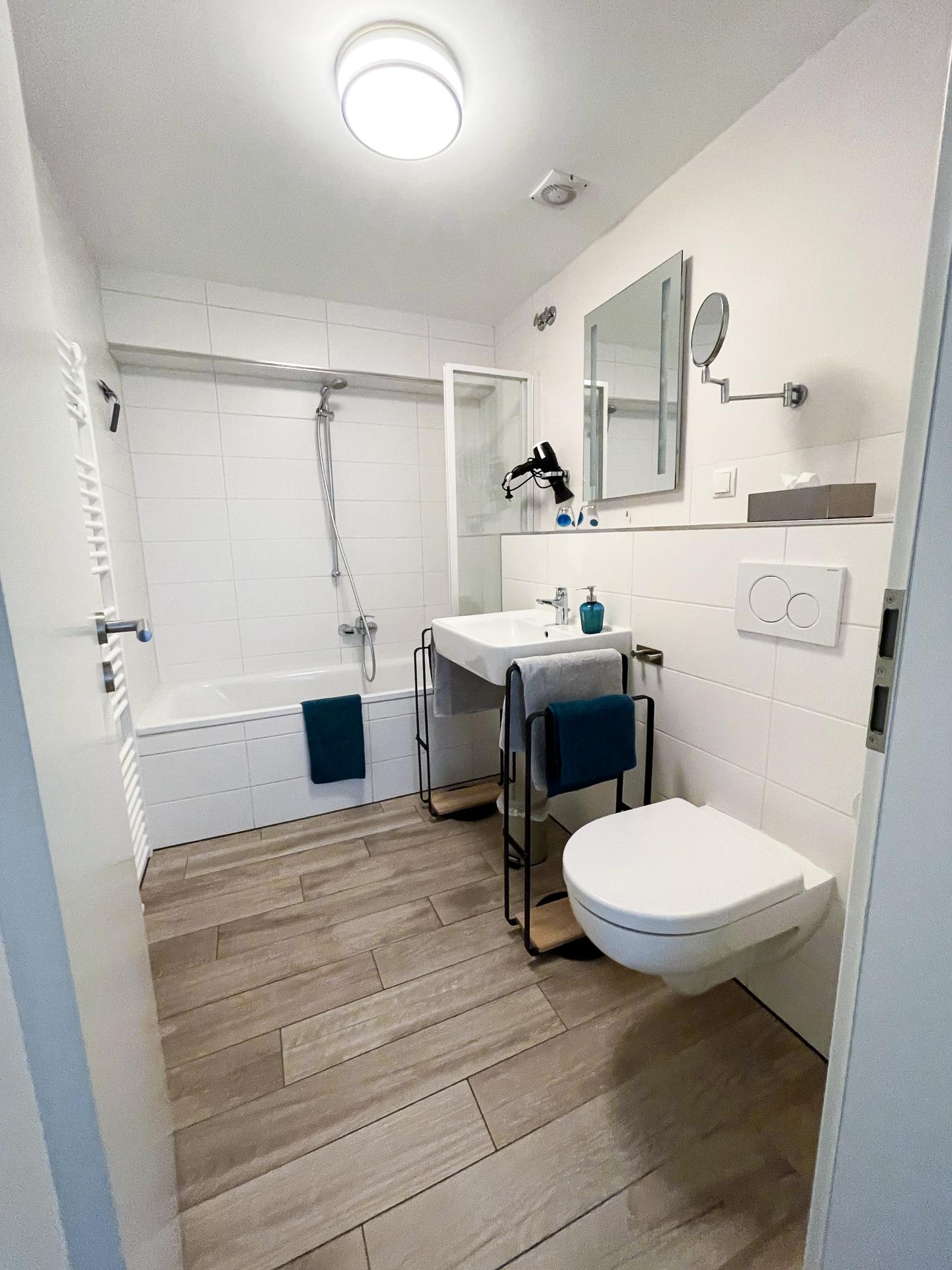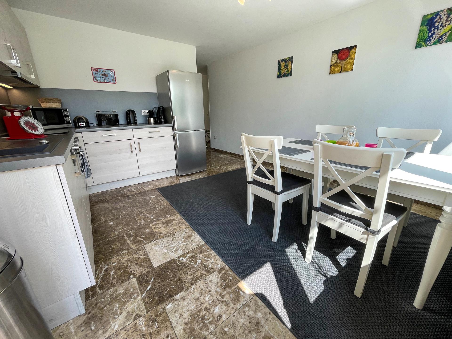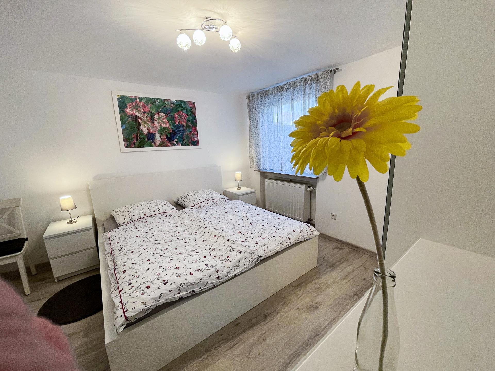 Die ca. 90 qm große moderne Nichtraucher-Ferienwohnung verfügt über zwei Schlafzimmer mit Doppelbetten, ein Wohnzimmer mit Schlafcouch, ein vollständig saniertes Bad sowie eine neue Wohnküche. Unsere Gäste dürfen den großen Garten gerne mitbenutzen. Auch Gartenmöbel, ein Sonnenschirm und ein Weber-Grill stehen für Sie zur Verfügung.