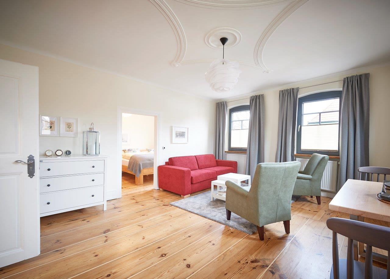 Unsere Wohnung „Landlust“ (81 qm) liegt im Obergeschoß unseres Ferienhauses und ist insgesamt geeignet für 4-5 Personen. Die Wohnung kann in zwei einzelne Bereiche separiert werden.