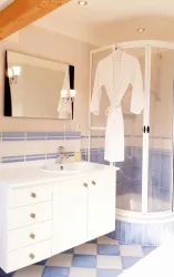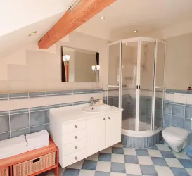 Das Badezimmer ist ausgestattet mit einem WC, einer Dusche und einer Eckbadewanne.