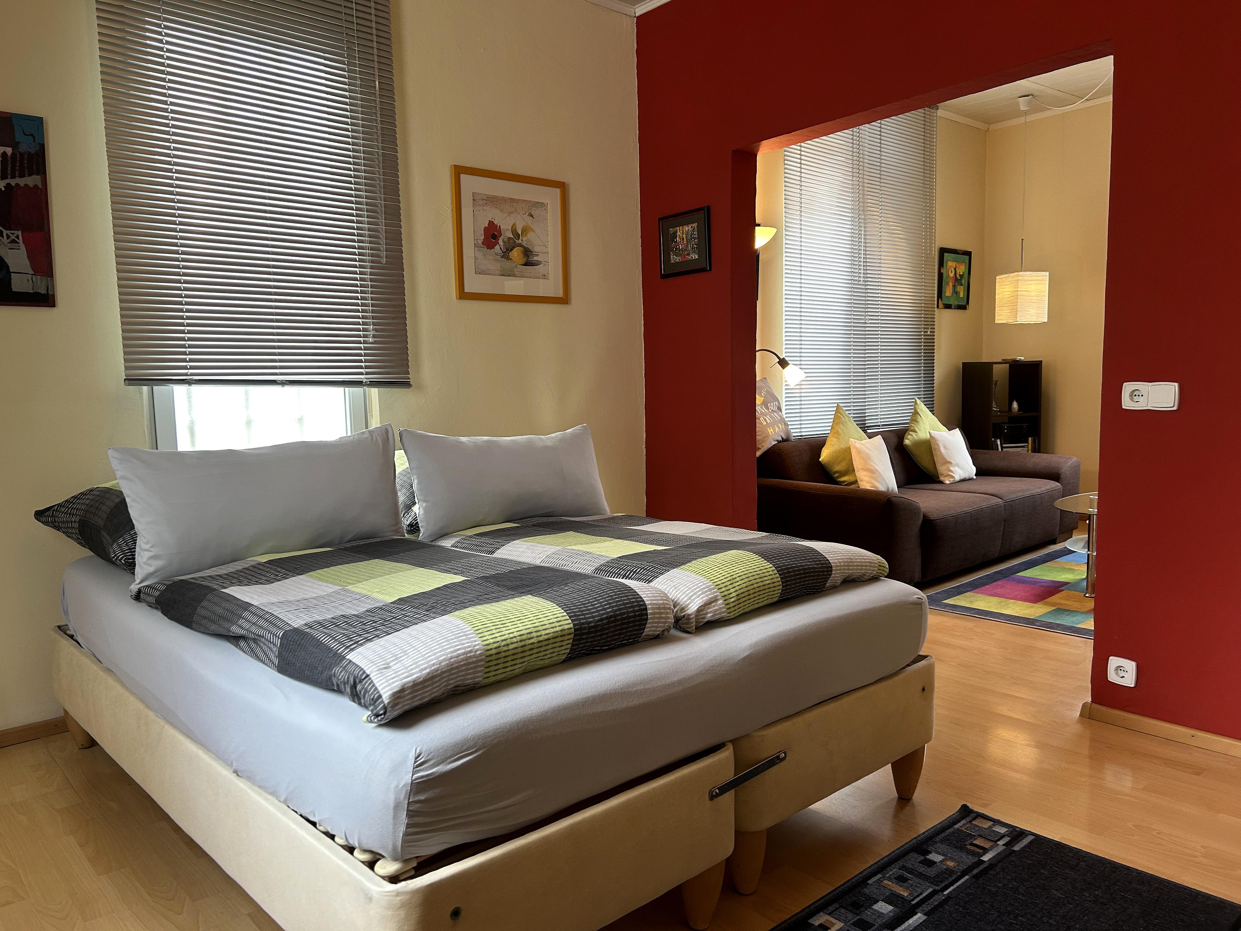 ➔ Gemütlicher kombinierter Wohn-Schlafbereich mit Doppelbett (H3,1,60m x 2m) auf der einen und bequemen Sofa, LCD-Smart-TV und Stereo auf der anderen Seite, sowie eine vom Wohnbereich getrennte gut ausgestattete Küche inkl Basics mit Essplatz, die u.a. für Kaffee Liebhaber eine italienische Bialetti bereit hält. Free Wifi in allen Bereichen.