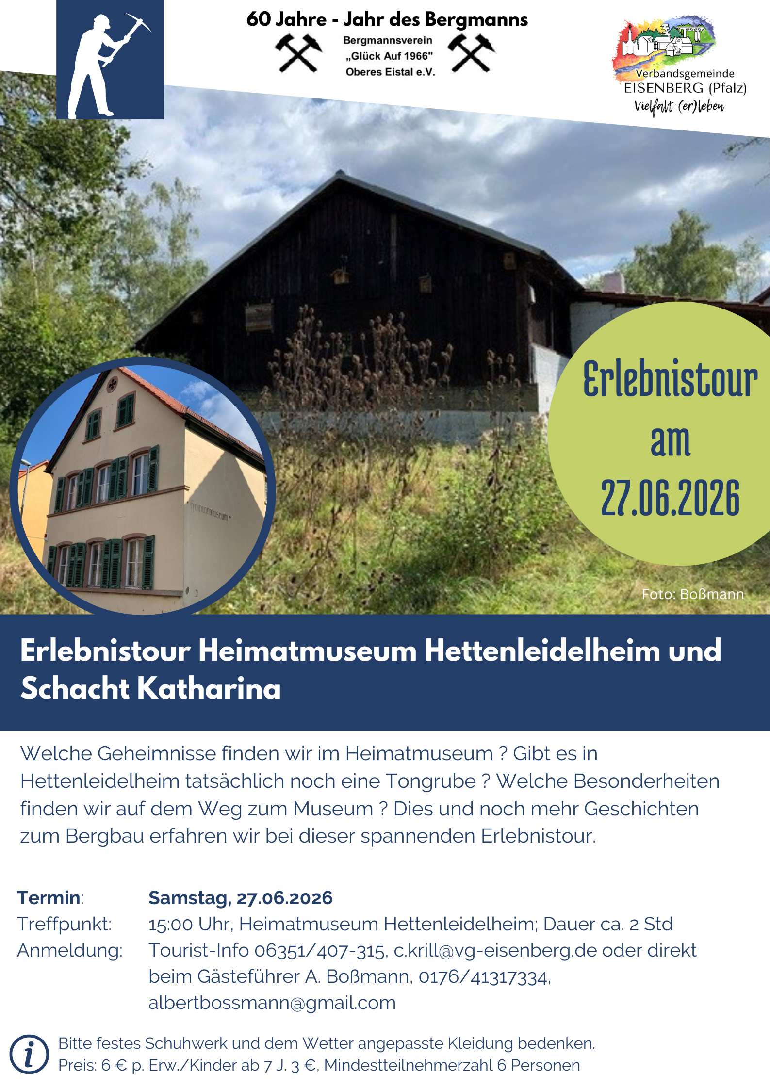 Anmeldung: Tourist-Info 06351/407-315, c.krill@vg-eisenberg.de oder direkt beim Gästeführer A. Boßmann, 0176/41317334, albertbossmann@gmail.com