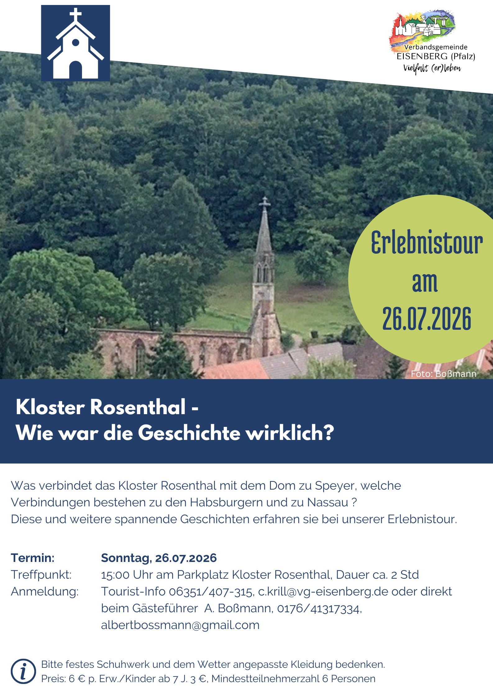 Anmeldung: Tourist-Info 06351/407-315, c.krill@vg-eisenberg.de oder direkt beim Gästeführer A. Boßmann, 0176/41317334, albertbossmann@gmail.com