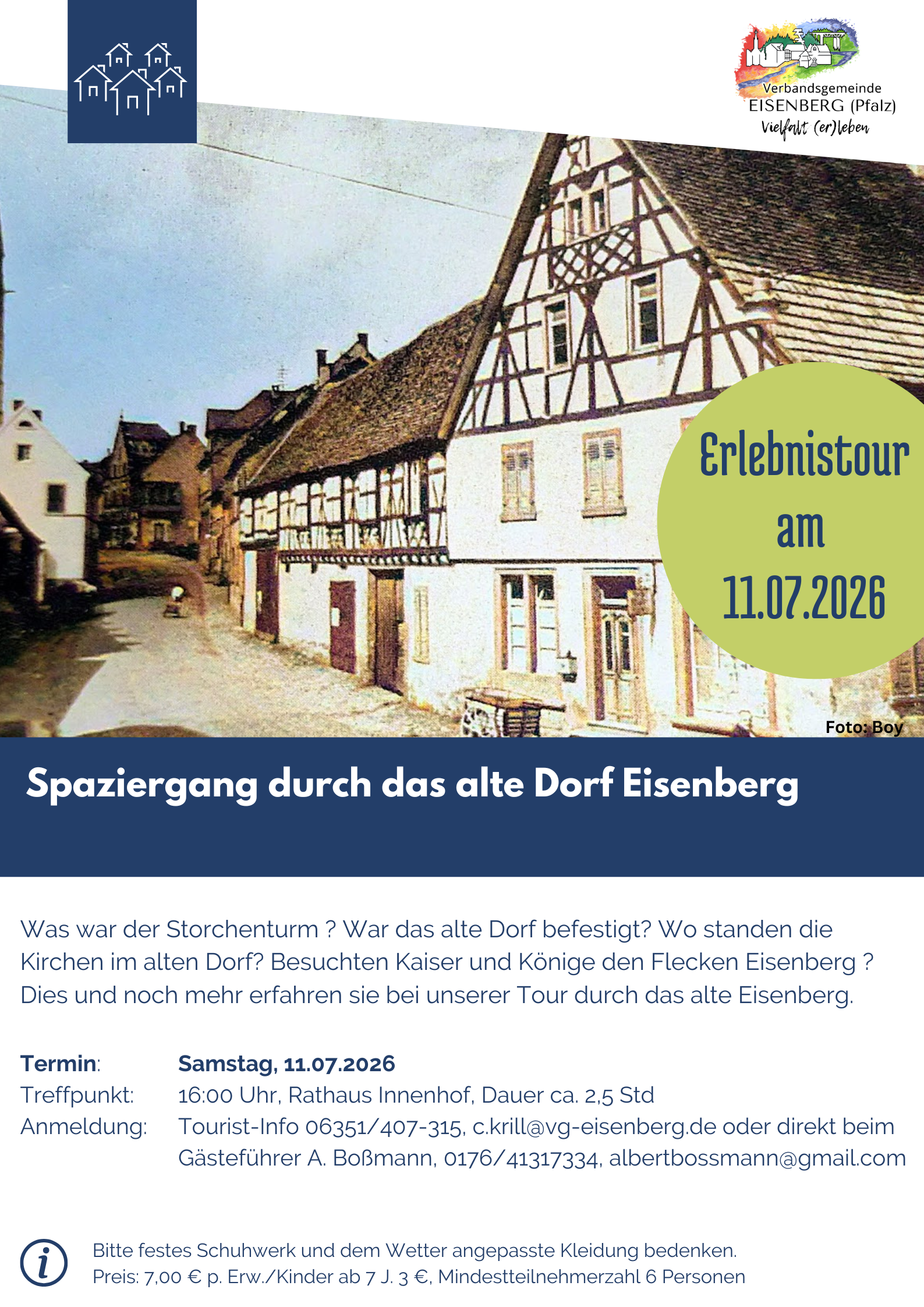 Anmeldung: Tourist-Info 06351/407-315, c.krill@vg-eisenberg.de oder direkt beim Gästeführer A. Boßmann, 0176/41317334, albertbossmann@gmail.com
