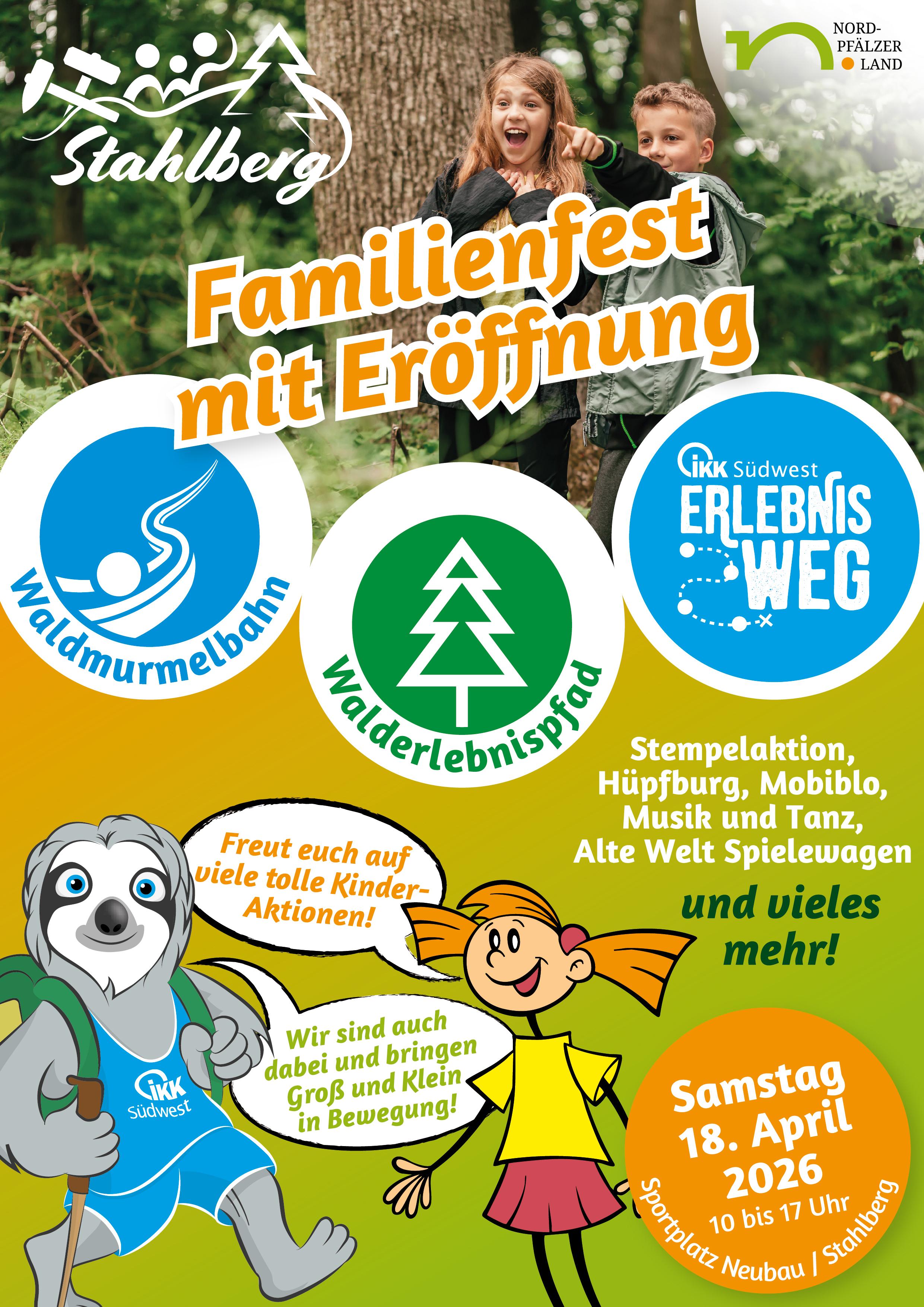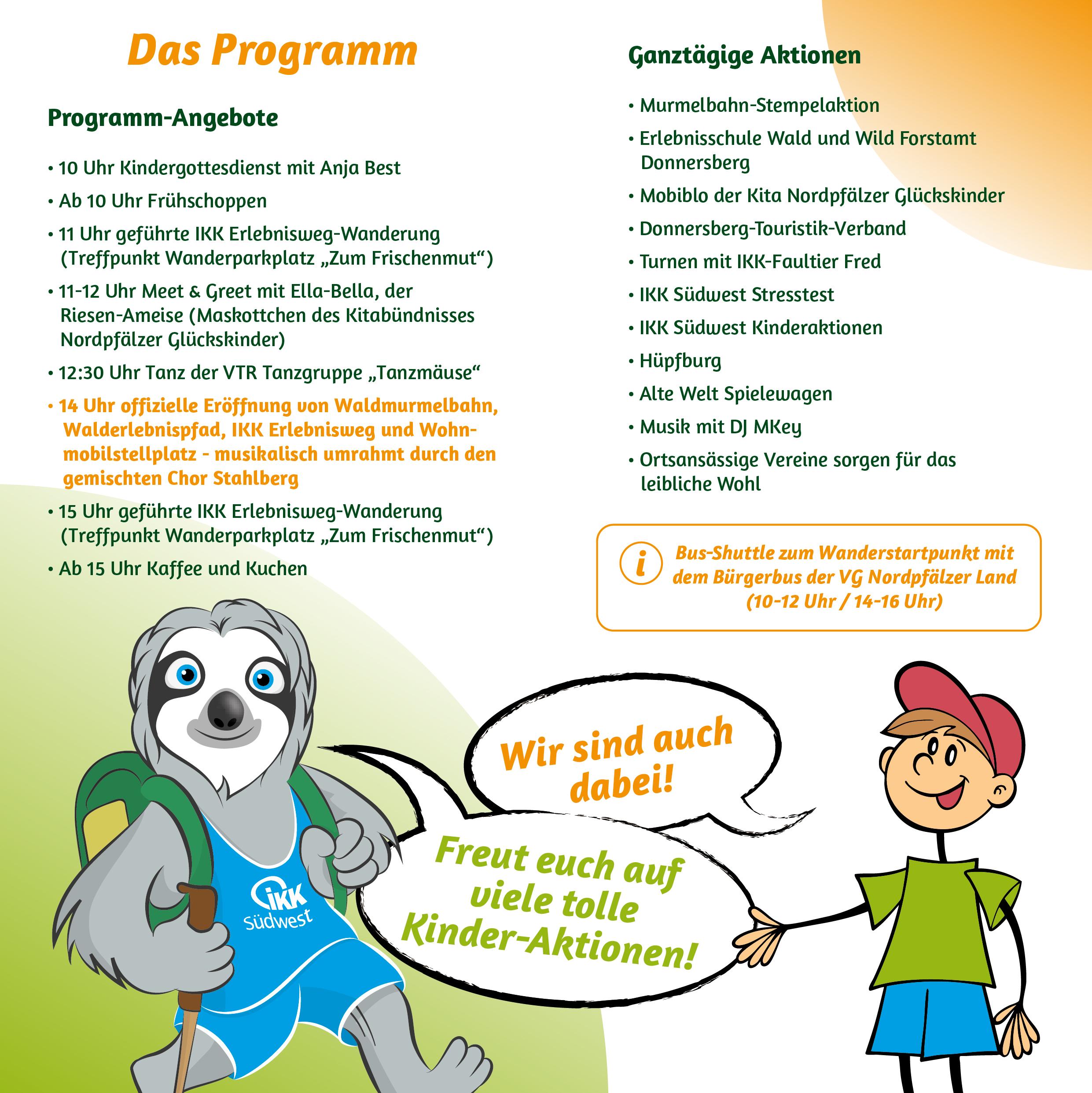 Von 10-17 Uhr erwarten die Gäste viele Familienaktionen rund um das Thema Wald. Kinder können in der Erlebnisschule Wald und Wild des Forstamtes Donnersberg Waldtiere bestaunen und beim Baumrindenquiz rätseln. Auf der Hüpfburg wie auch bei vielen Outdoorspielen kann getobt werden. Für eine kleine Pause bietet sich die Mobiblo, die mobile Kinderbücherei der VG Kita Nordpfälzer Glückskinder an. Die IKK Südwest kommt mit einem Gesundheitsprogramm für Groß und Klein. Von Stresstest für Erwachsene und Kinderturnen mit dem Faultier Fred für die Kleinen wird ein Bewegungsangebot geboten. Zusätzlich werden zwei geführte Touren auf dem IKK Erlebnisweg durchgeführt. Ein buntes Bühnenprogramm mit den VTR Tanzmäusen, ein Meet & Greet mit Ella-Bella der Ameise, das Maskottchen der Nordpfälzer Glückskinder, und Musik mit DJ MKey runden das Programm an diesem Tag ab. Für die offizielle Eröffnung um 14 Uhr werden Vertreter der Kommunal- und Landespolitik erwartet.