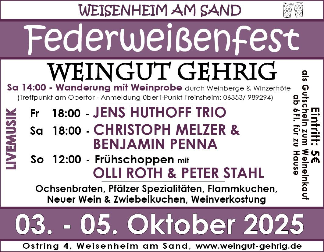 4 Weingüter laden Sie herzlichst zum Federweißenfest nach Weisenheim am Sand zu neuem Wein und Zwiebelkuchen ein.
