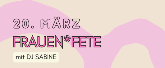 Wir lassen es krachen, nur für uns! Wir feiern uns selbst, unsere Stärke, unsere Power! Bei unserer Frauen*fete heißt es: tanzen, lachen, einfach genießen, ein Abend nur für Frauen* . Wir feiern zu den besten Beats der 70er, 80er und 90er Jahre – alles, was Frau* liebt und Spaß macht! Ein Abend voller Gute-Laune-Musik, Bewegung und Female Vibes, bei dem wir zusammen die Welt draußen lassen. Tanzt, singt mit, genießt die Zeit nur für euch, weil wir es verdient haben, uns selbst zu feiern!