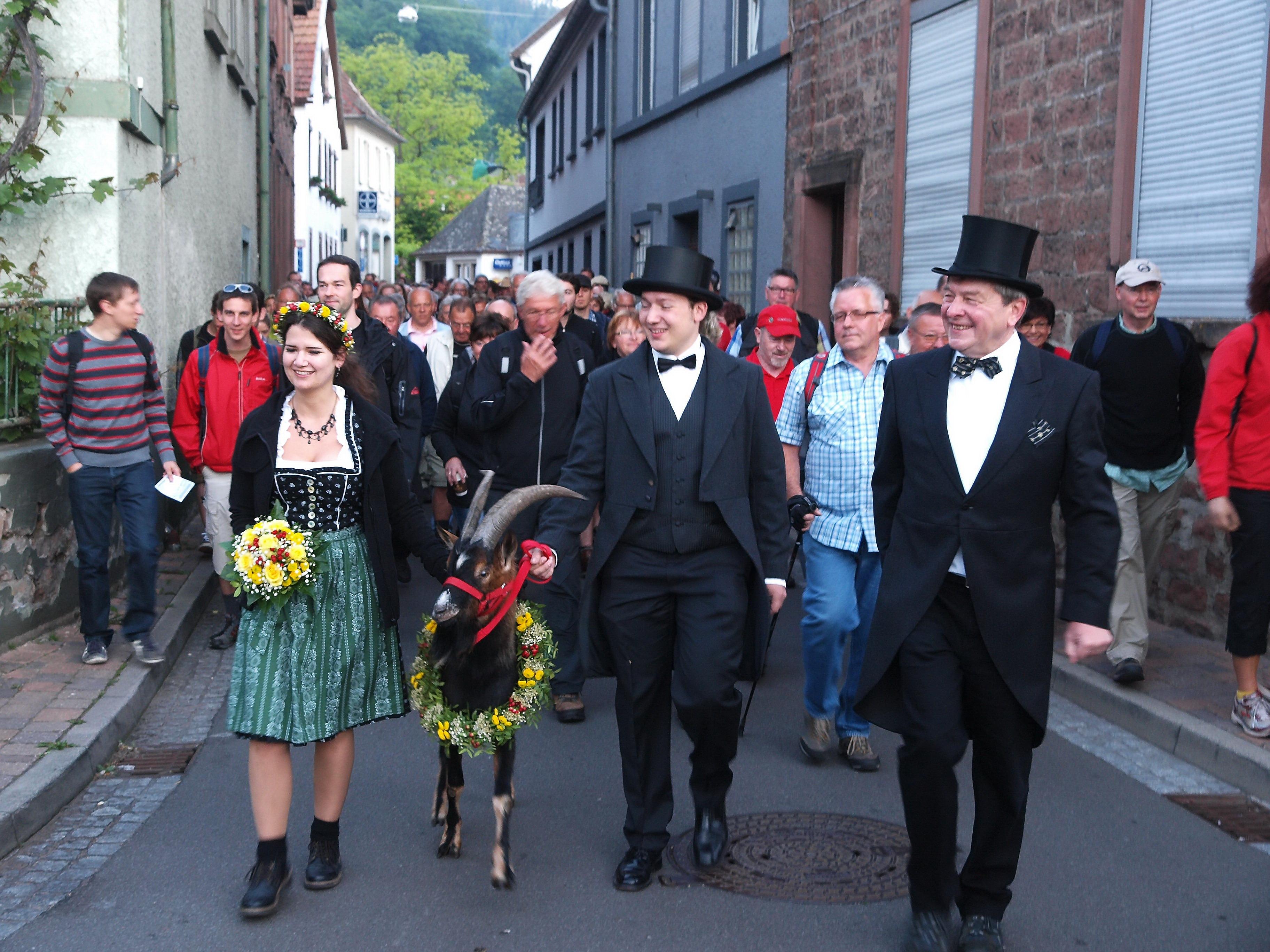 Dazu startet am Pfingstdienstag um 5:30 Uhr auf der Friedrich-Ebert-Brücke in Lambrecht der Geißbockmarsch nach Deidesheim. Mehrere hundert Mitwanderer begleiten das Geißbockbrautpaar mit dem Tribut-Geißbock auf ihrem 14 Kilometer langen Marsch durch den Wald nach Deidesheim.