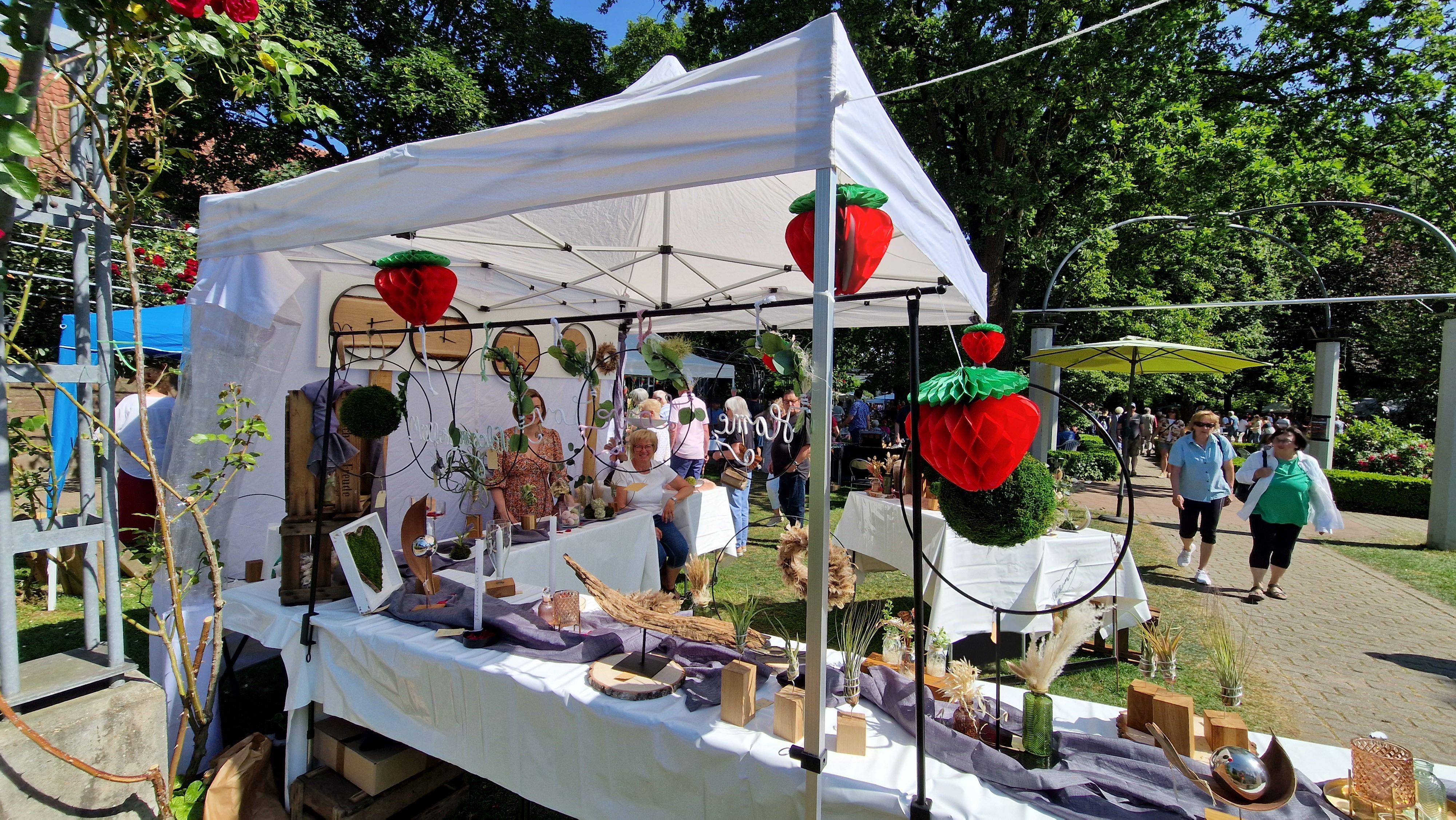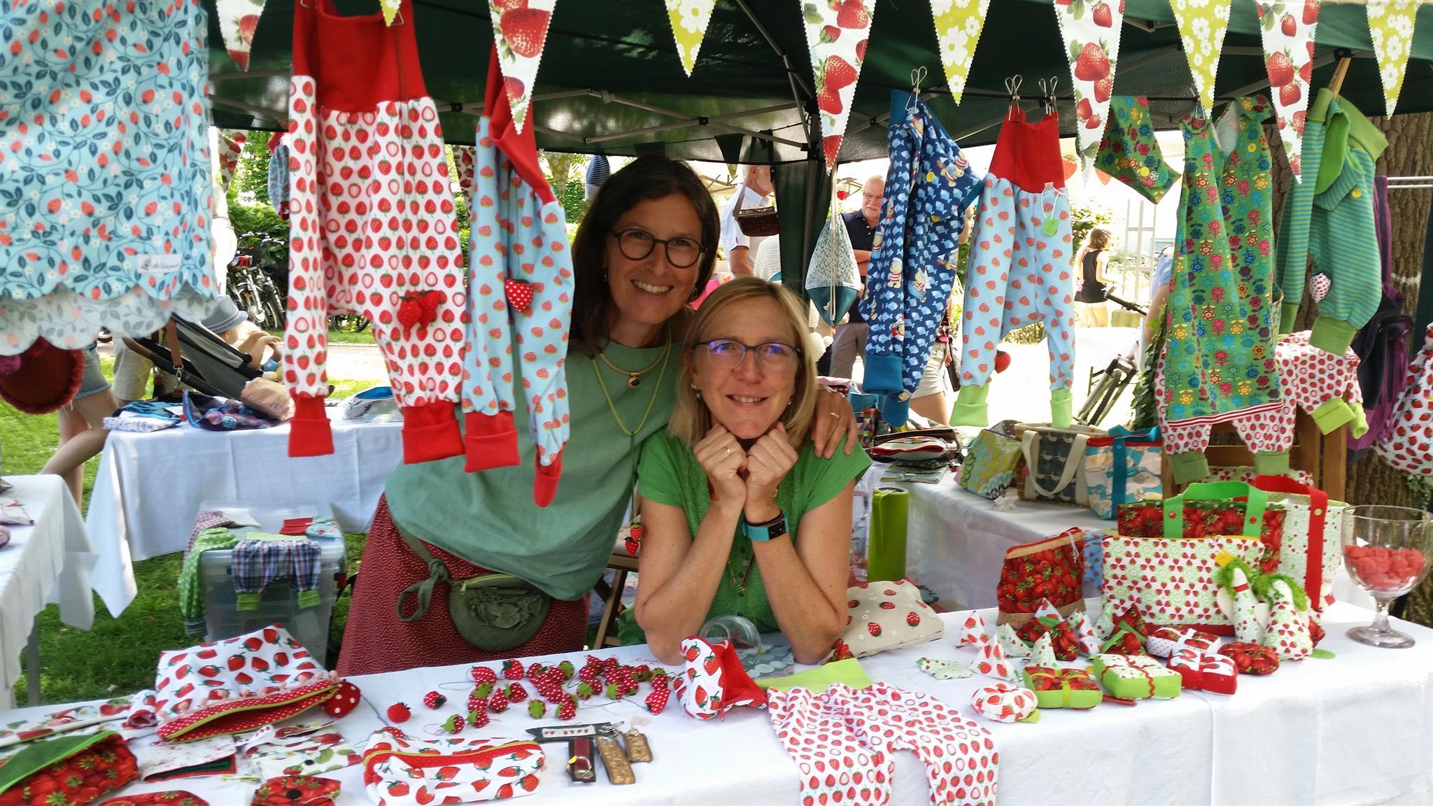 An den vielen Marktständen kann Kunsthandwerk in vielen Variationen bewundert und gekauft werden. Filzarbeiten, Schmuck, Postkarten, selbst genähte Taschen, Decken und Kissen sowie Kinderkleider mit erfrischenden Erdbeermotiven, Keramik, Kunst aus Holz und Gartendeko sind im fantasievollen Angebotssortiment vertreten.
