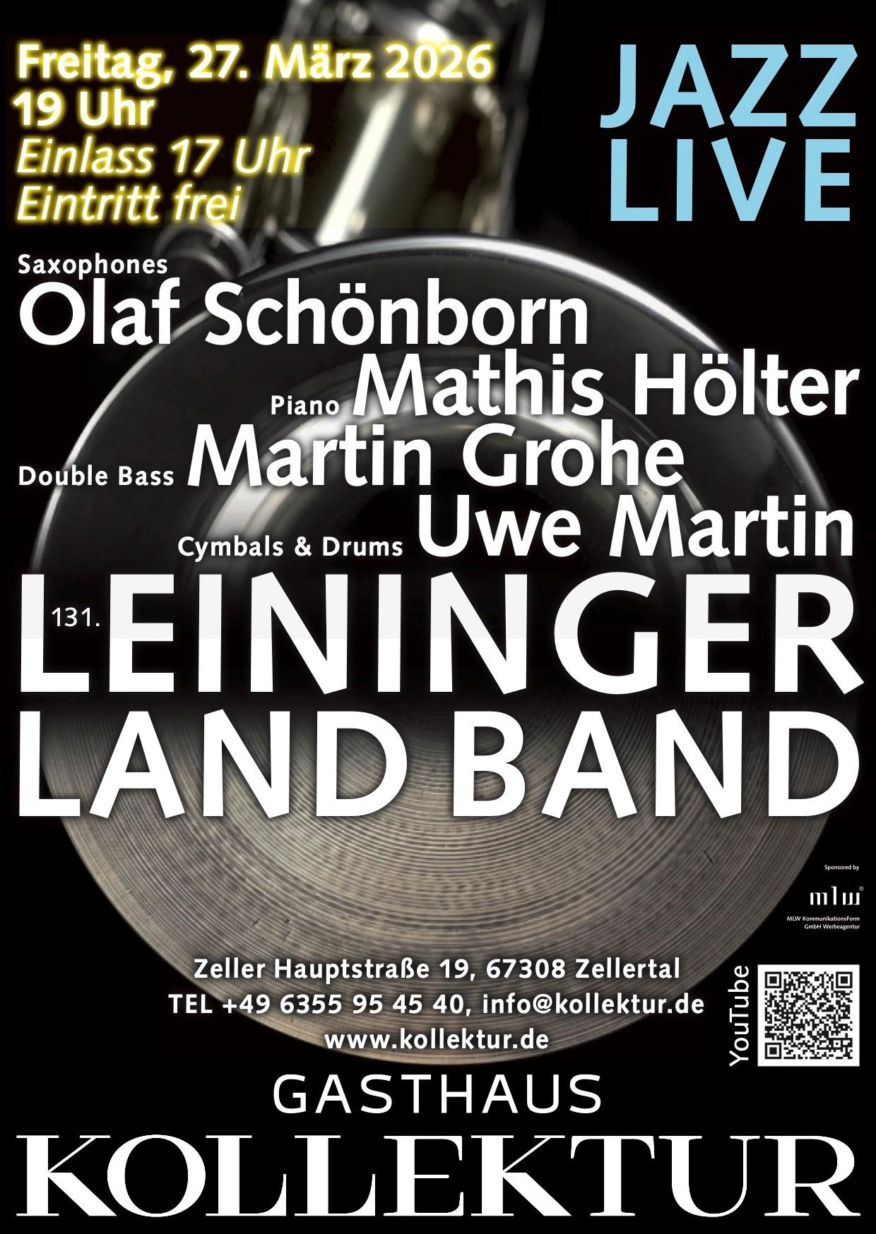 Die Leiningerland Band ist eine feste Größe im Pfalzer Jazzleben – und diesmal mit einer ganz besonderen Besetzung bei uns zu Gast: Olaf Schönborn (Saxophone), Mathis Hölter (Piano), Martin Grohe (Kontrabass) und Uwe Martin (Drums).