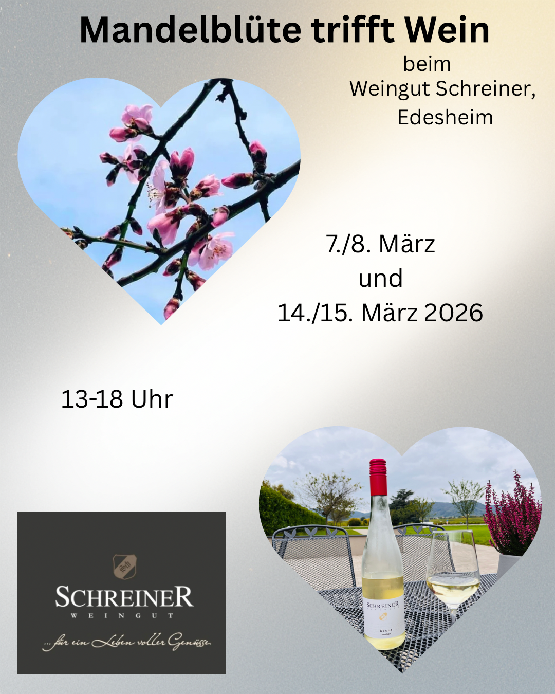 Erleben Sie die zauberhafte Zeit der Mandelblüte in stimmungsvoller Atmosphäre beim Weingut Schreiner in Edesheim. An den Wochenenden 7./8. März sowie 14./15. März 2026, jeweils von 13–18 Uhr, laden wir Sie herzlich ein, unsere Weine zu genießen und den Frühling willkommen zu heißen.