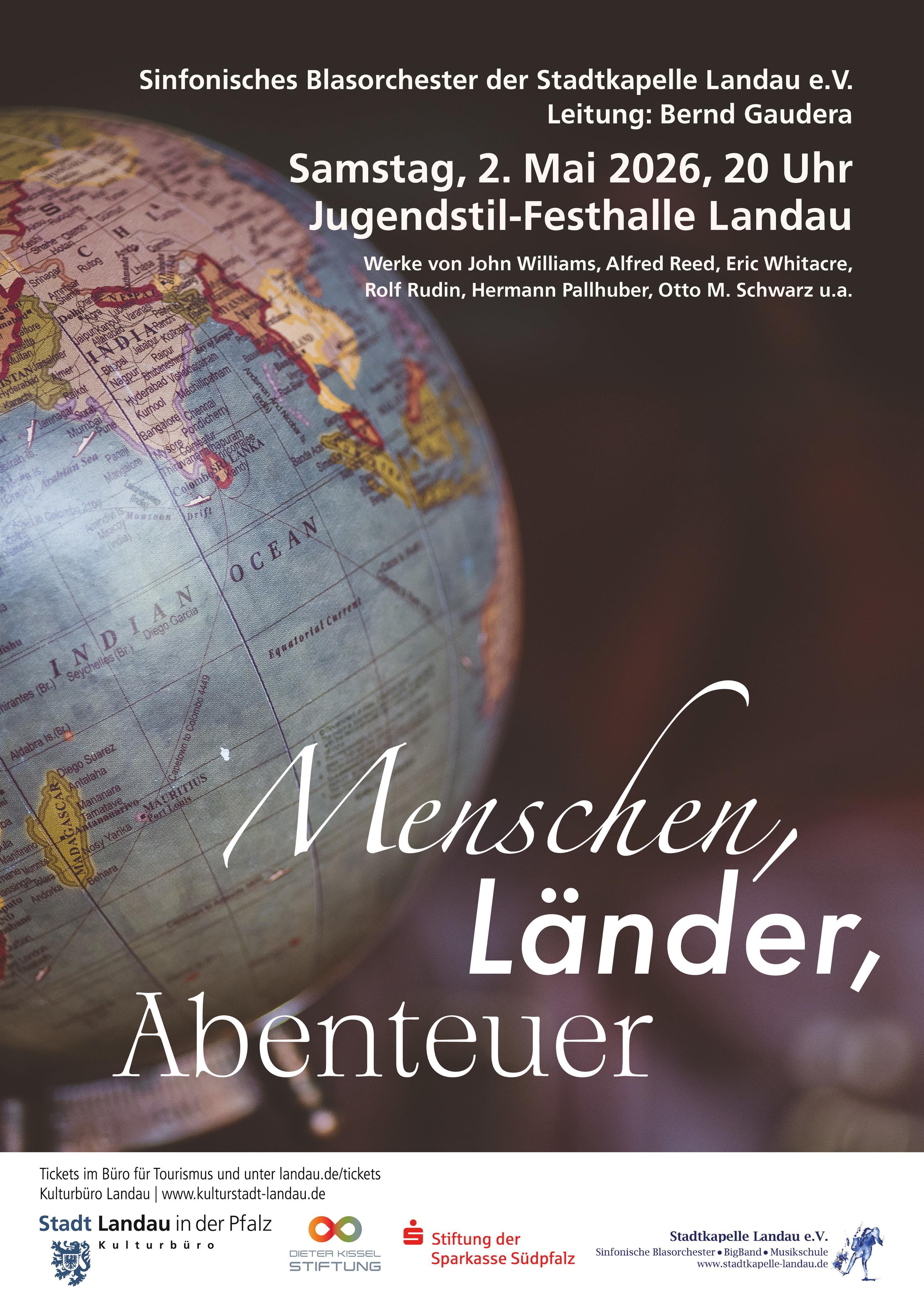 „Menschen, Länder, Abenteuer“ nimmt das Publikum mit auf eine außergewöhnliche musikalische Reise, die die Faszination des Reisens und die Sehnsucht nach dem Unbekannten zum Leben erweckt. Unter der Leitung von Bernd Gaudera, dem Dirigenten der Stadtkapelle Landau, erleben wir eine Vielzahl musikalischer Eindrücke, die uns in ferne Länder und auf spannende Abenteuer führen.