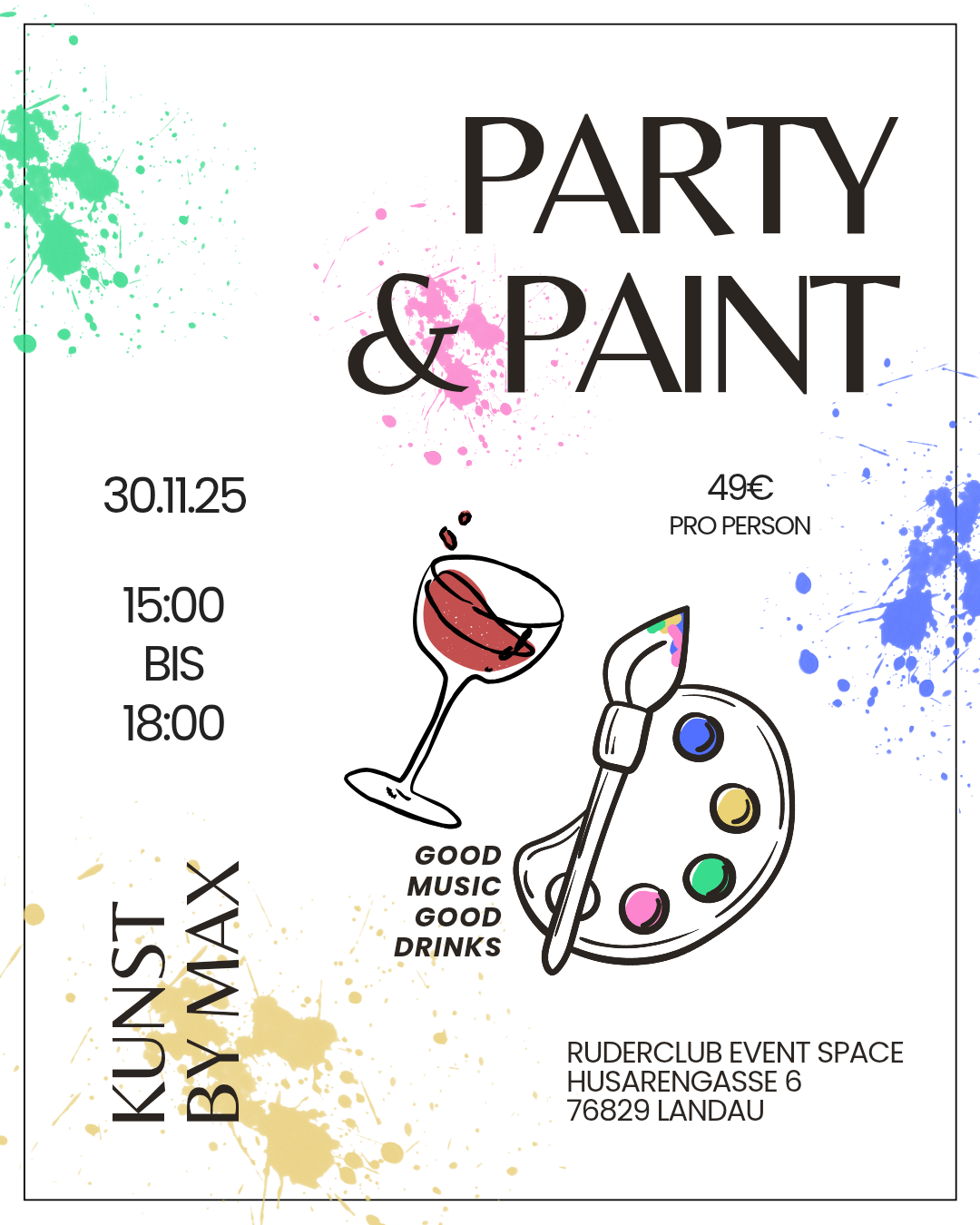Bei dem Event malt jeder auf eine eigene Leinwand, während Techno und Elektro Musik im Hintergrund läuft. Dazu gibt es verschiedene Drinks und Snacks. Man braucht kein Vorwissen und im Vordergrund steht das gemeinsame Spaß haben und kreativ sein. Das Ganze findet im Ruder-Club Eventspace in Landau statt.