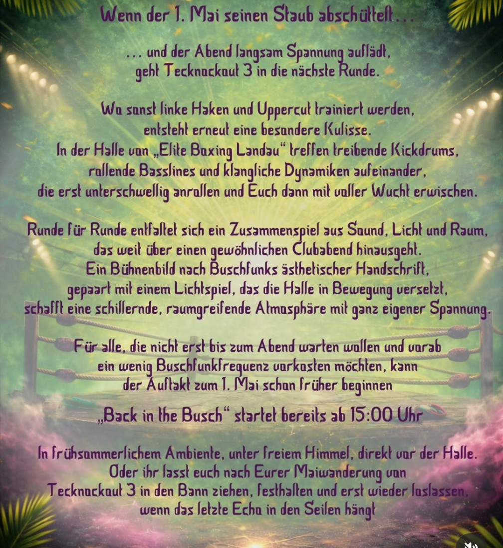 Wo sonst linke Haken und Uppercut trainiert werden, entsteht erneut eine besondere Kulisse. In der Halle von "Elite Boxing Landau" treffen treibende Kickdrums, rollende Basslines und klangliche Dynamiken aufeinander, die erst unterschwllig anrollen und Euch dann mit voller Wucht erwischen.