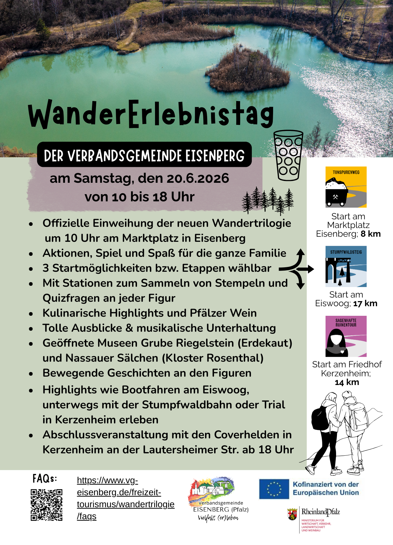 Eröffnung der Wandertrilogie "Industriekultur erleben" mit großem Wandererlebnistag und buntem Rahmenprogramm entlang der drei Etappen. Kulinarische Highlights, musikalische Unterhaltung sowie Stempelkarten entlang des Weges erwarten Wanderer, Familien und Pfalzliebhaber. Los geht´s um 10 Uhr mit der offiziellen Eröffnung in Eisenberg am Marktplatz. Es gibt 3 Etappen und damit auch drei Startpunkte: in Eisenberg am Marktplatz, in Kerzenheim am Friedhof oder in Ramsen am Eiswoog. Weitere Infos auch unter: https://www.vg-eisenberg.de/freizeit-tourismus/wandertrilogie/