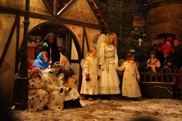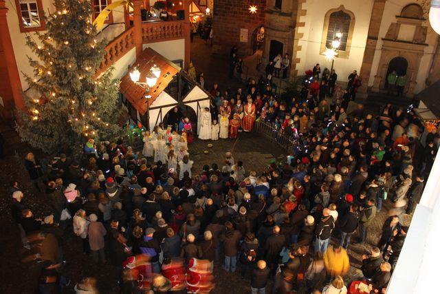 Als einzigartige Besonderheit und Höhepunkt des jeweiligen Abends wird samstags und sonntags jeweils um 17:00 Uhr die Weihnachtsgeschichte in Pfälzer Mundart vorgetragen und vor dem historischen Rathaus mit einer „lebendigen Krippe“ nachgespielt. Große und kleine Freinsheimer schlüpfen dabei in verschiedene Rollen.