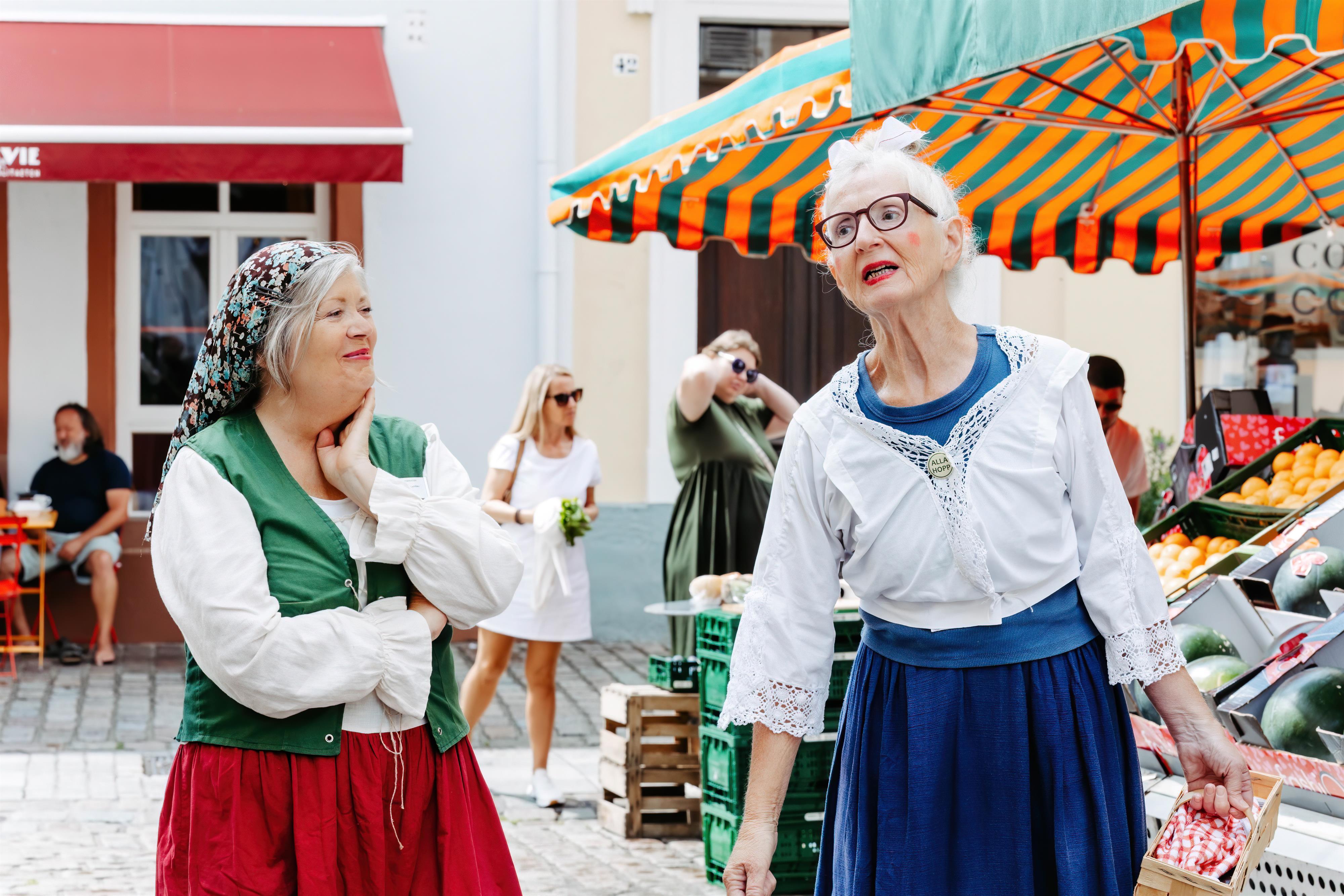 Die Landauer Marktweiber Bawwette uns Hilde kommen gerade von ihrer Arbeit auf dem Landauer Markt.